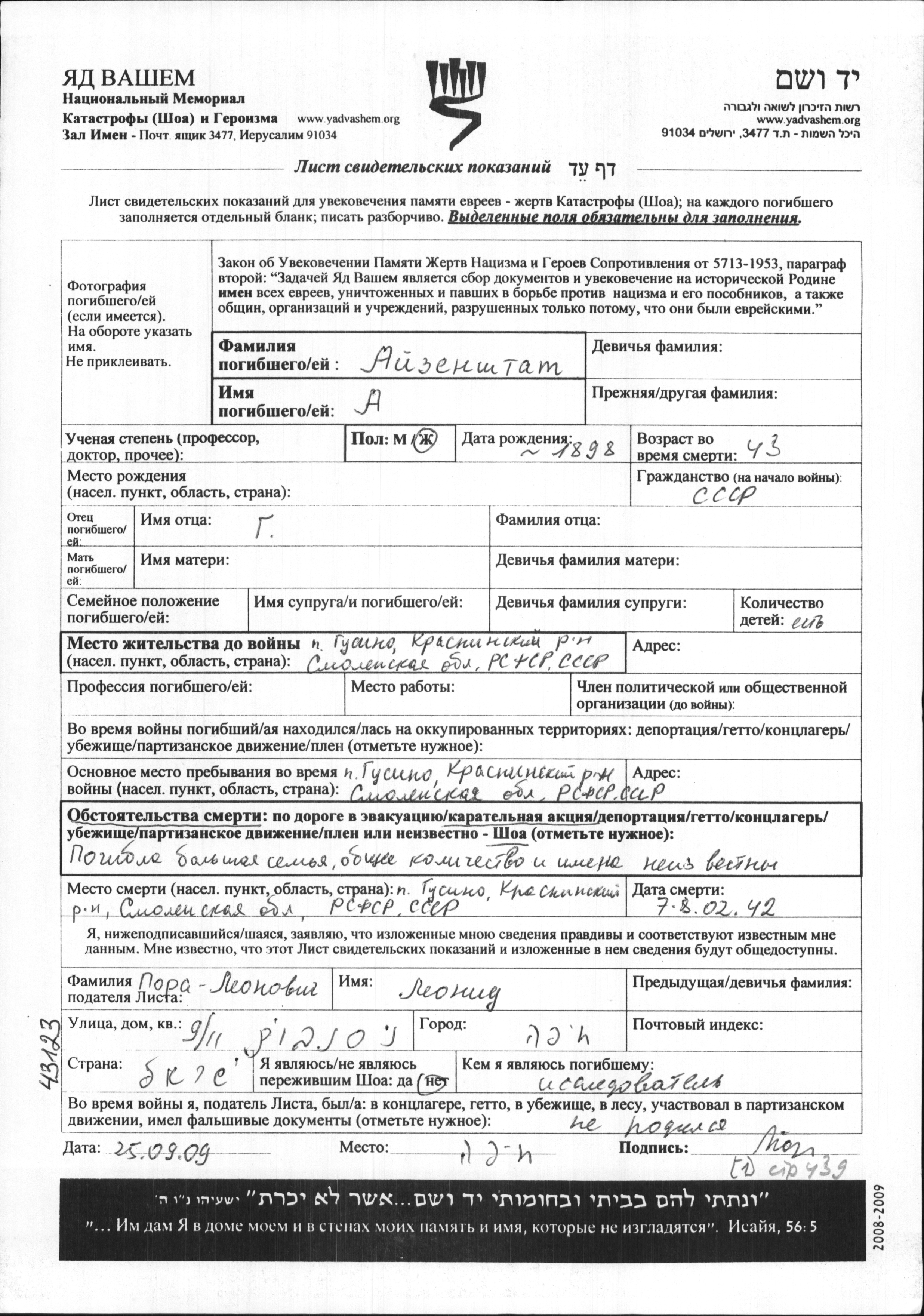 Aizenshtat A 1898 Gusino, Russia (USSR) Page of Testimony