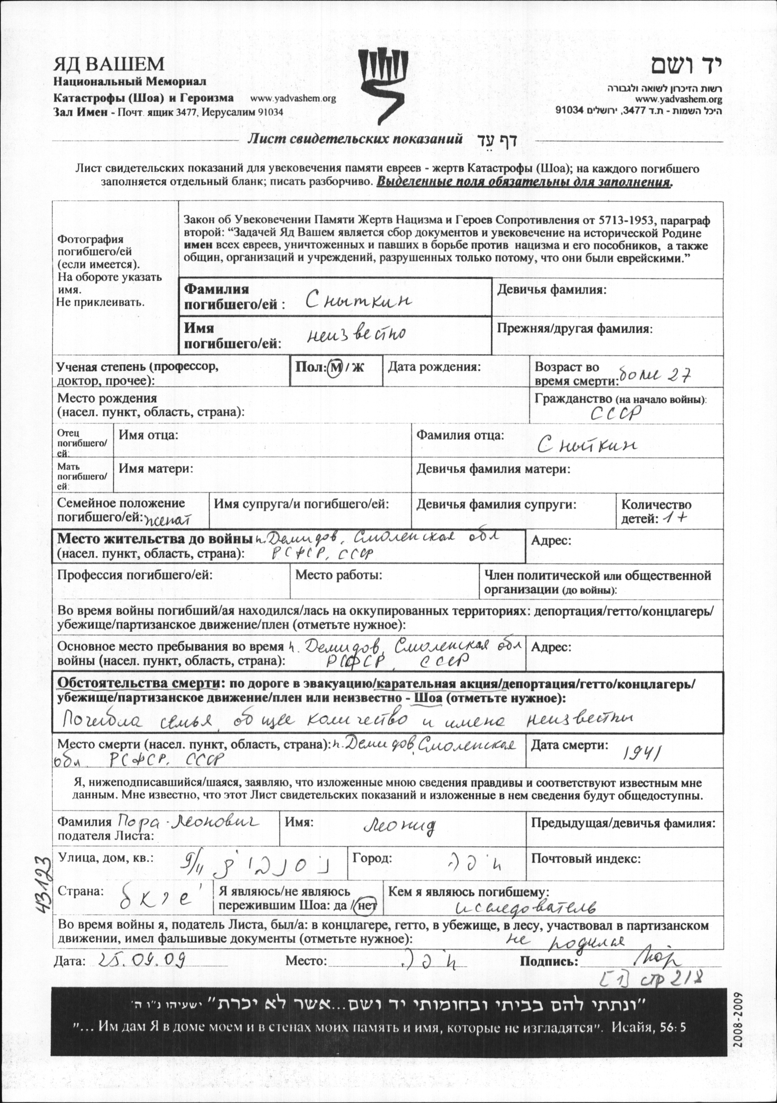 First name unknown Snytkin. He was married. Prior to WWII he lived in Demidov, Russia (USSR). During the war he was in Demidov, Russia (USSR). He was murdered in the Shoah. Place of death: Demidov, Russia (USSR), 1941.