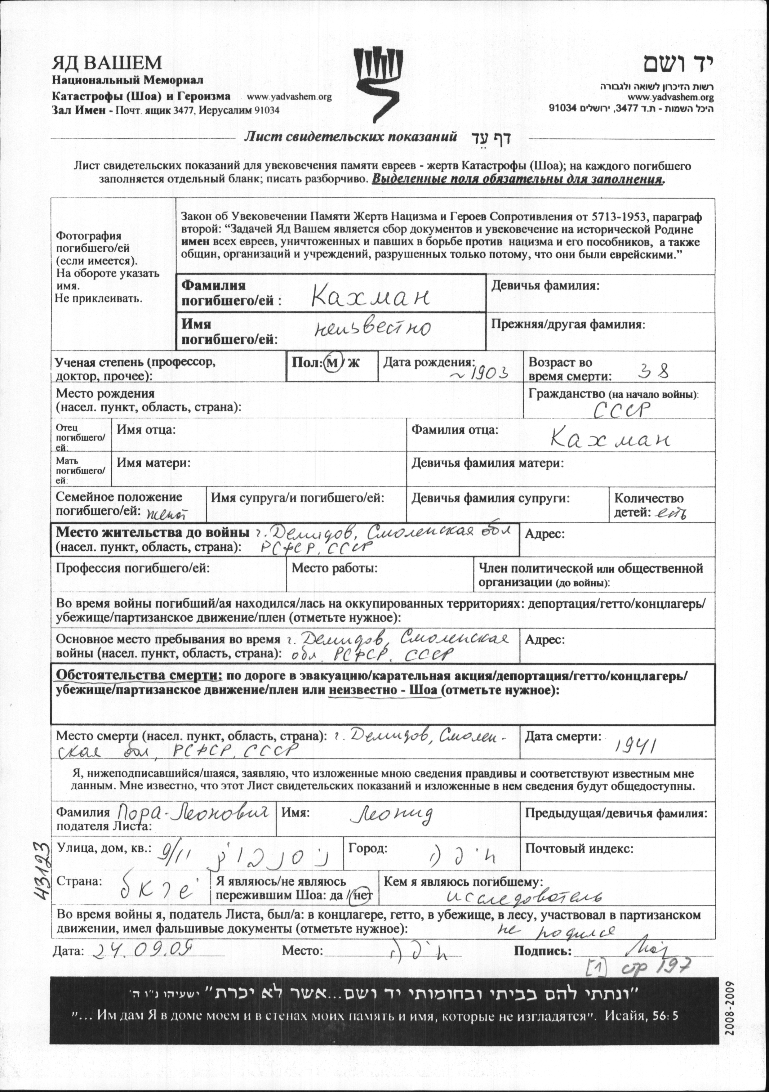 First name unknown Kakhman was born, 1903. He was married. Prior to WWII he lived in Demidov, Russia (USSR). During the war he was in Demidov, Russia (USSR). He was murdered in the Shoah. Place of death: Demidov, Russia (USSR), 1941.