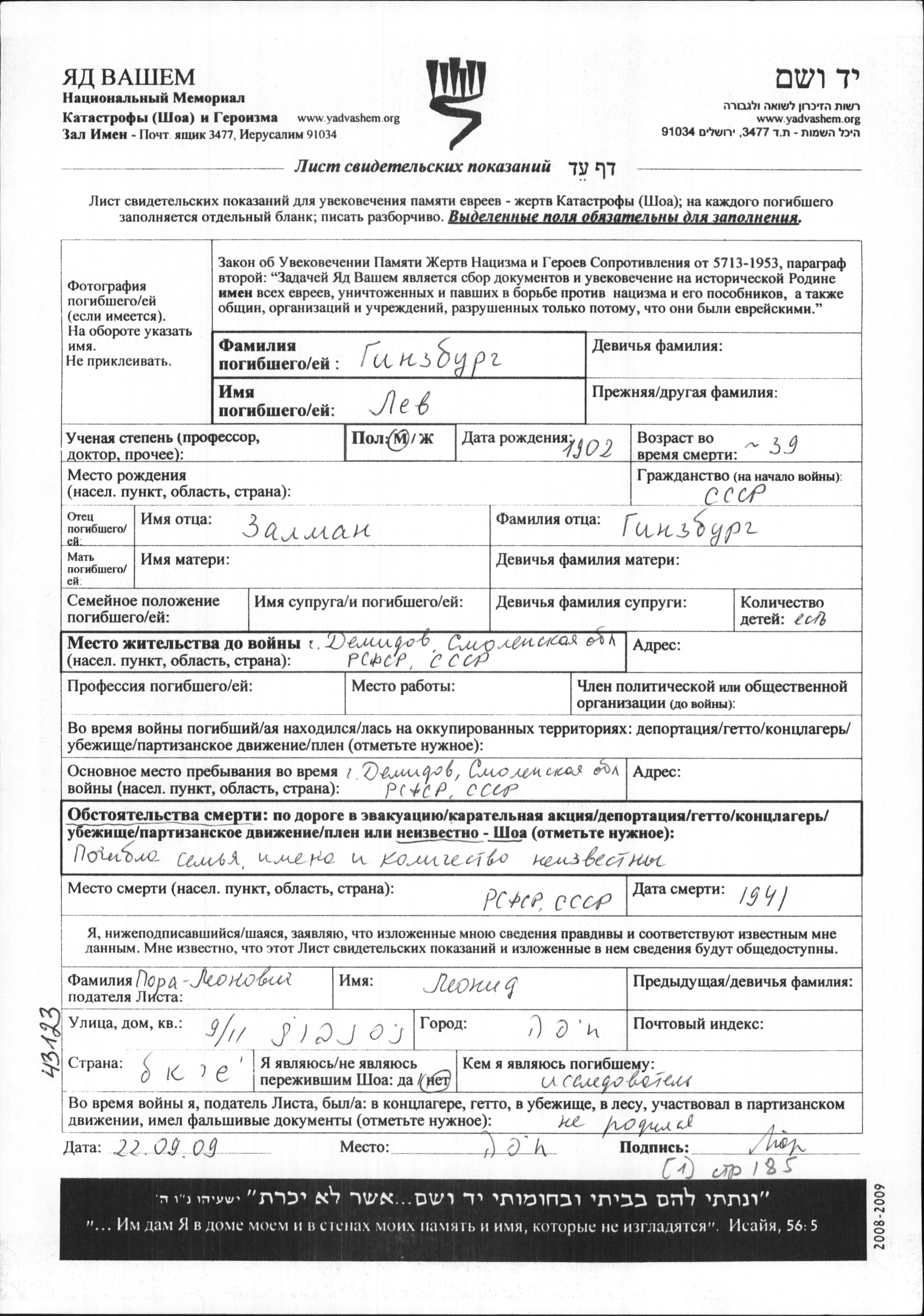 Lev Ginzburg was born, 1902 to Zalman. Prior to WWII he lived in Demidov, Russia (USSR). During the war he was in Demidov, Russia (USSR). Lev was murdered in the Shoah. Place of death: Russia (USSR), 1941.