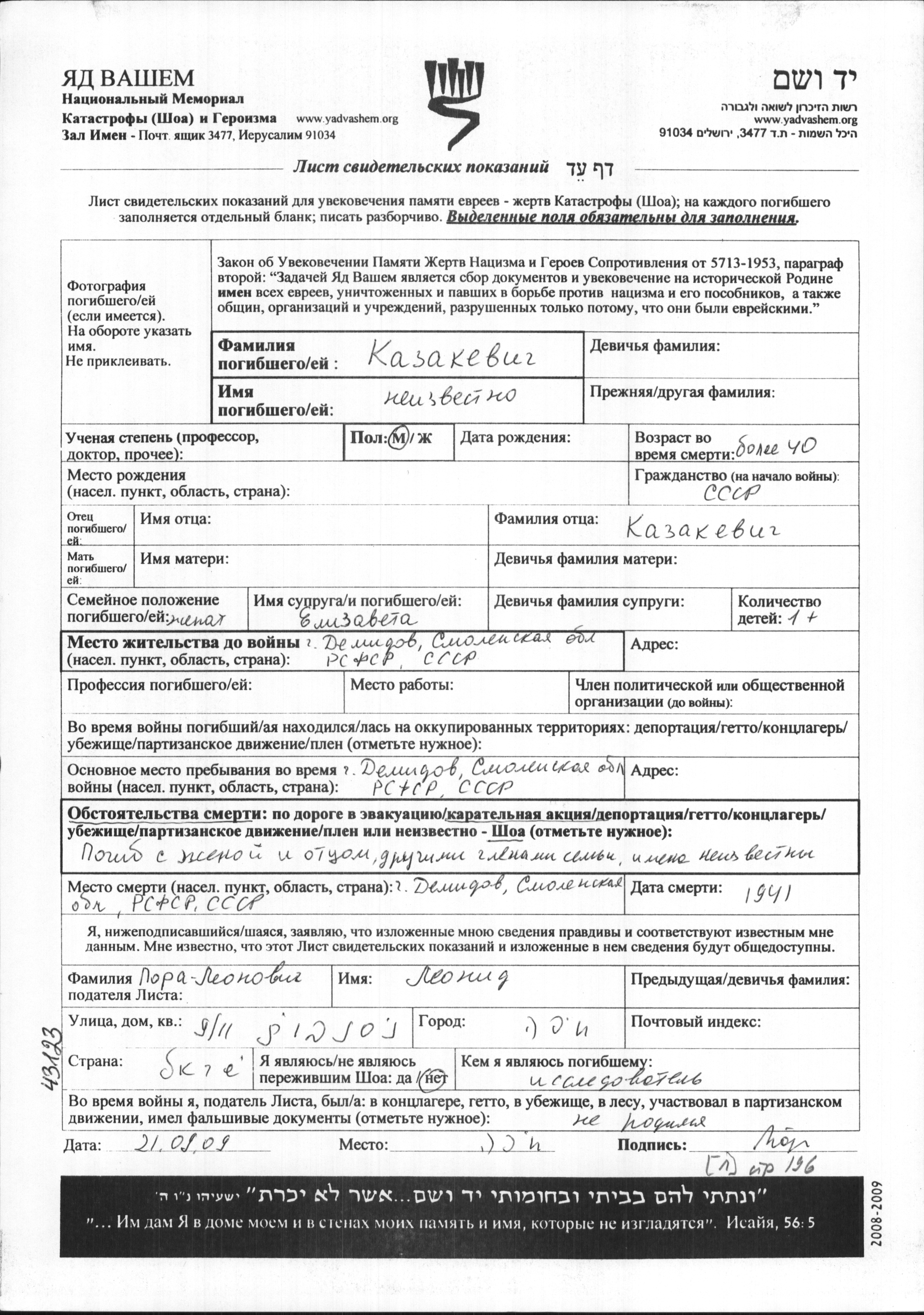 First name unknown Kazakevich. He was married to Yelizaveta. Prior to WWII he lived in Demidov, Russia (USSR). During the war he was in Demidov, Russia (USSR). He was murdered in the Shoah. Place of death: Demidov, Russia (USSR), 1941.