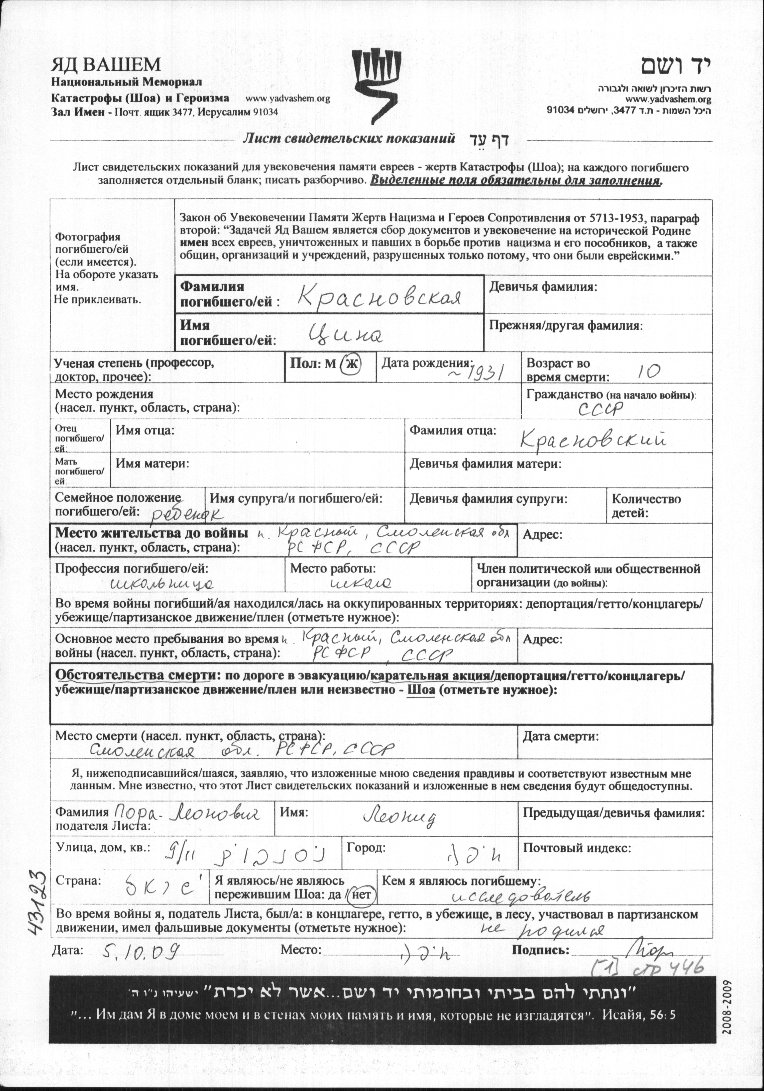 Tzipa Krasnovskaya was born, 1931. She was a schoolgirl and child. Prior to WWII she lived in Krasnyi, Russia (USSR). During the war she was in Krasnyi, Russia (USSR). Tzipa was murdered in the Shoah. Place of death: Smolensk, Russia (USSR).