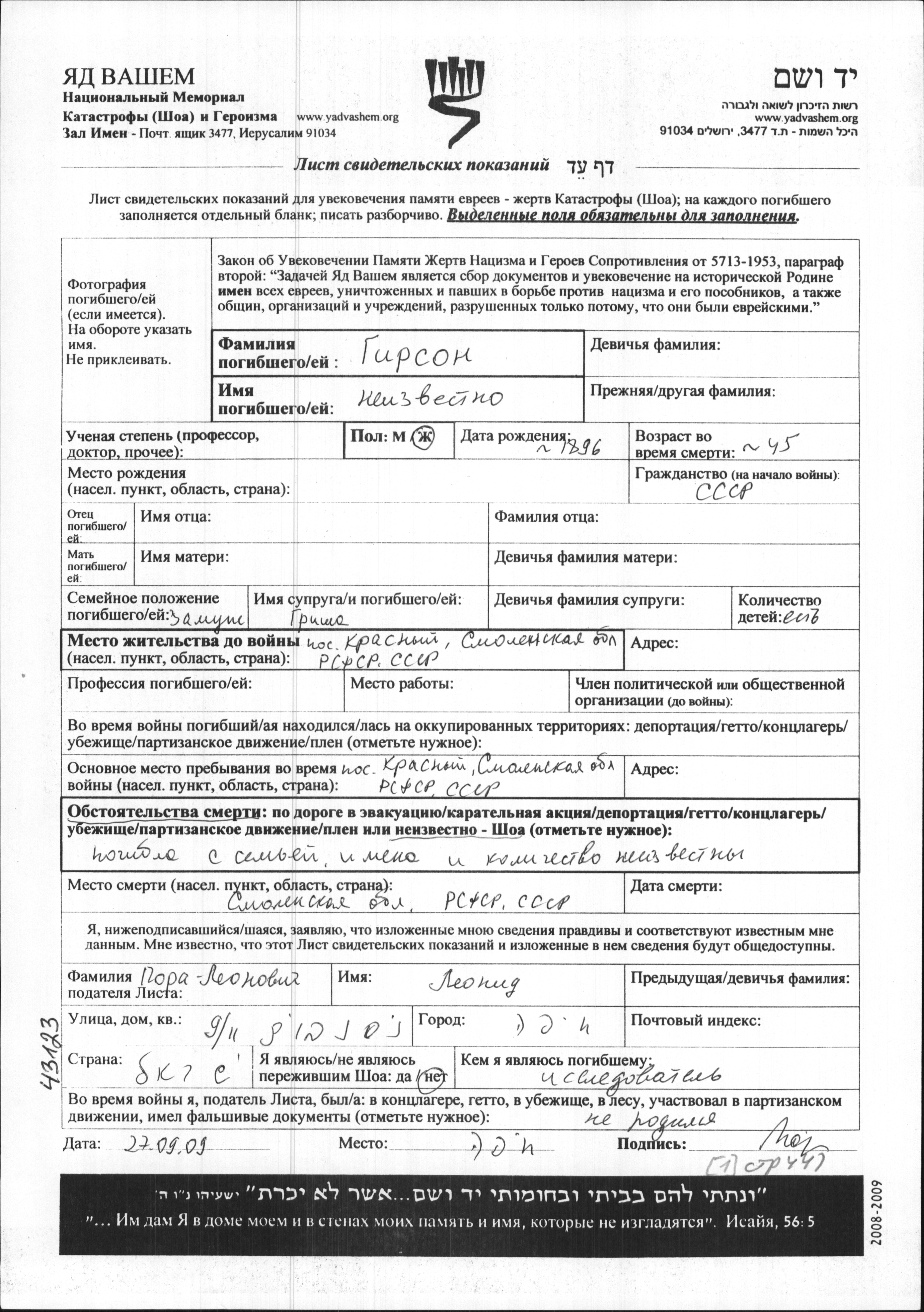 First name unknown Girson was born, 1896. She was married to Grisha. Prior to WWII she lived in Krasnyi, Russia (USSR). During the war she was in Krasnyi, Russia (USSR). She was murdered in the Shoah. Place of death: Smolensk, Russia (USSR).