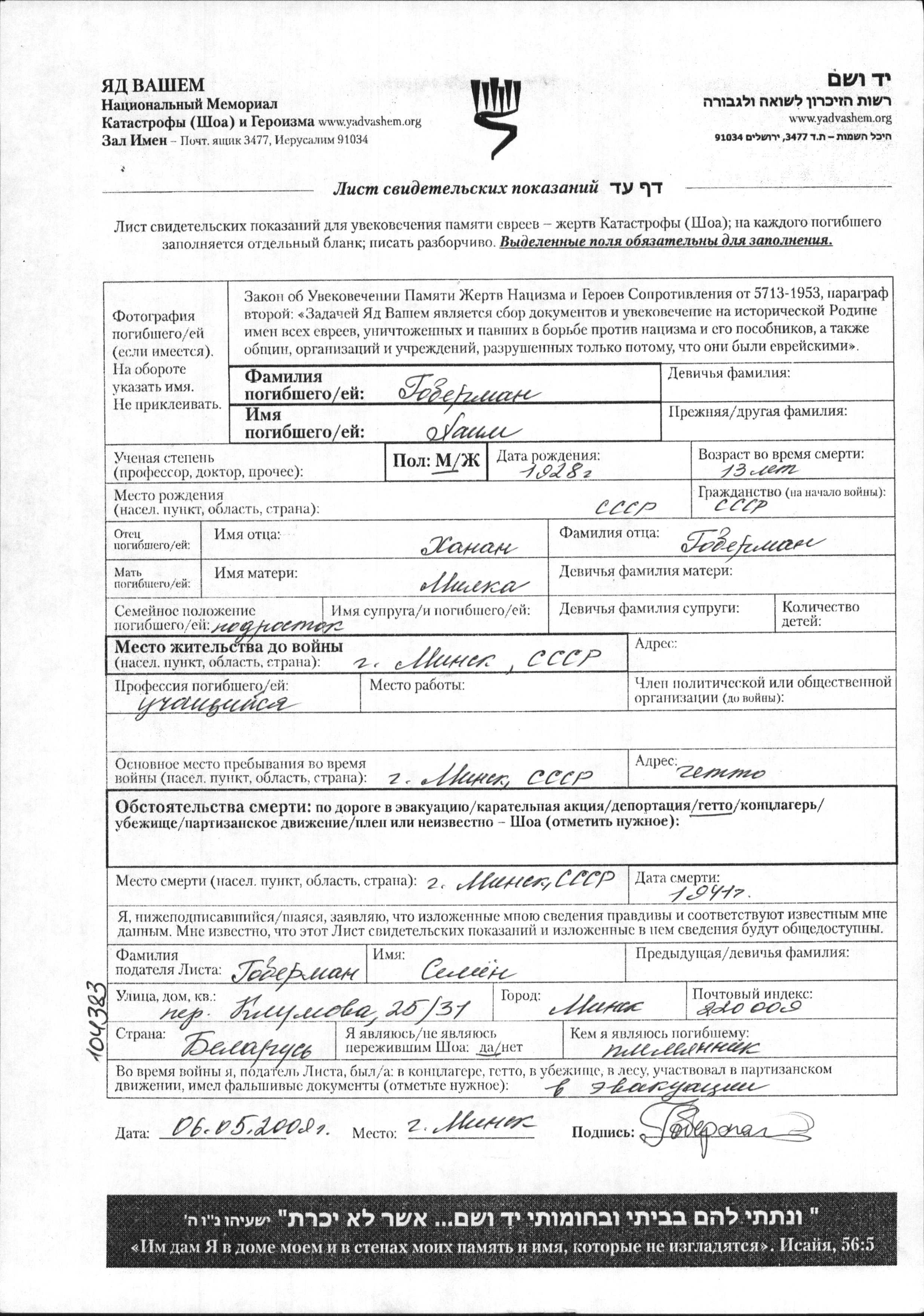 Khaim Goberman was born in Soviet Union, 1928 to Khanan and Milka. He was a pupil and child. Prior to WWII he lived in Minsk, Belorussia (USSR). During the war he was in Minsk, Belorussia (USSR). Khaim was murdered in the Shoah. Place of death: Minsk, Belorussia (USSR), 1941.