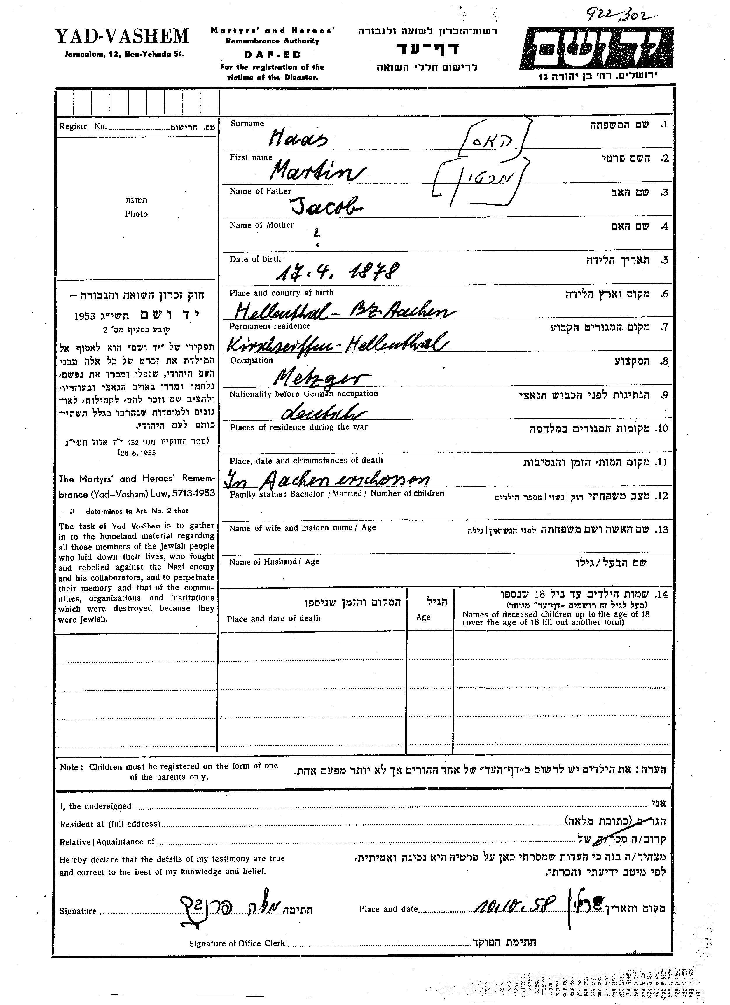 Haas Martin 1878 Hellenthal, Germany Page of Testimony