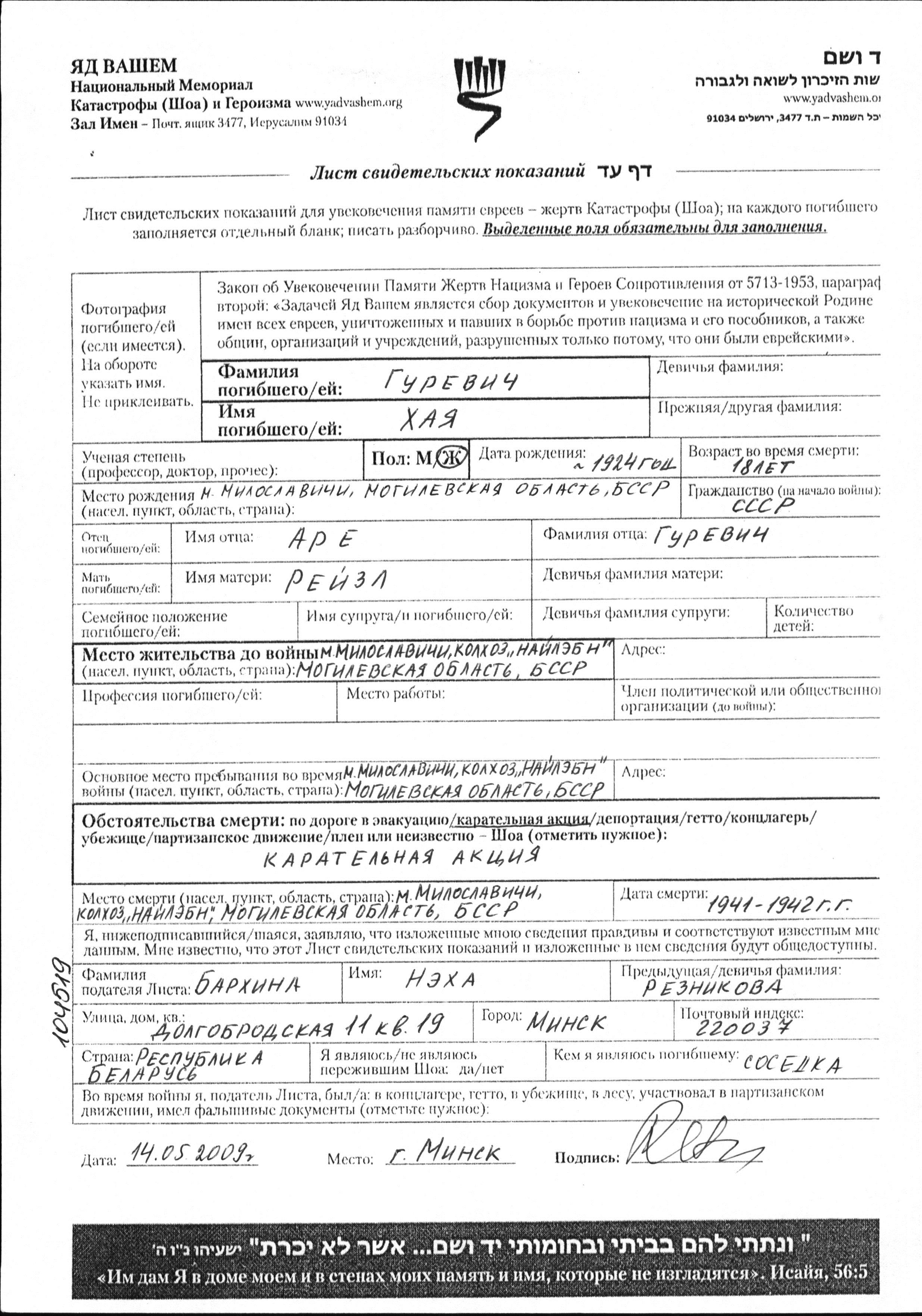 Khaya Gurevich was born in Miloslavichi, Belorussia (USSR), 1924 to Are and Reizl. She was single. Prior to WWII she lived in Miloslavichi, Belorussia (USSR). During the war she was in Nayleben Kolkhoz, Belorussia (USSR). Khaya was murdered in the Shoah. Place of death: Miloslavichi, Belorussia (USSR), 1942.