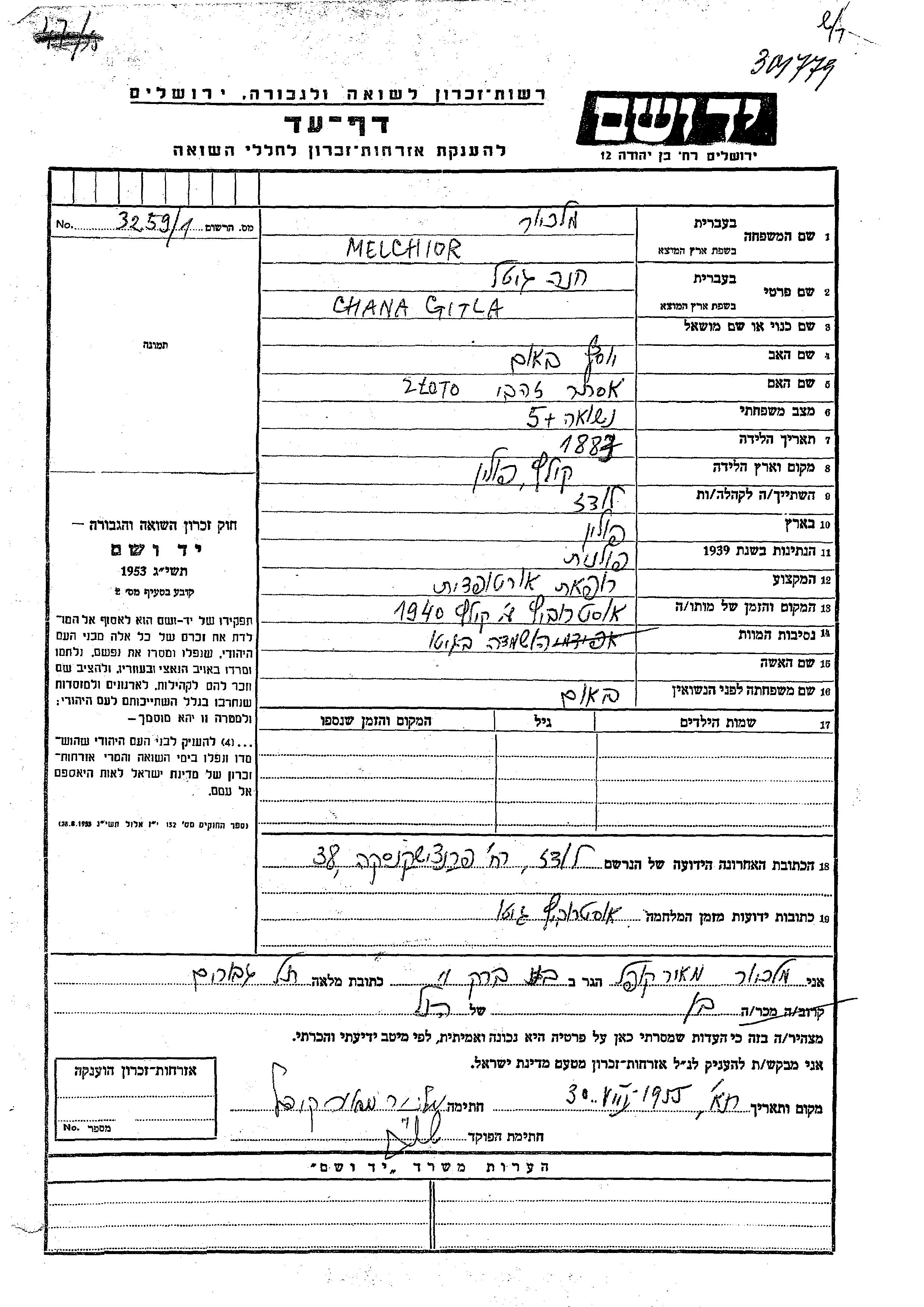 Chana Gitla Melchior nee Baum was born in Kielce, Poland, 1883 to Yosef and Ester. She was a רופאה אורטופדית and married. Prior to WWII she lived in Lodz, Poland. During the war she was in Ostrovitza, Poland. Chana Gitla was murdered in the Shoah. Place of death: Ostrovitza, Poland, 1940.