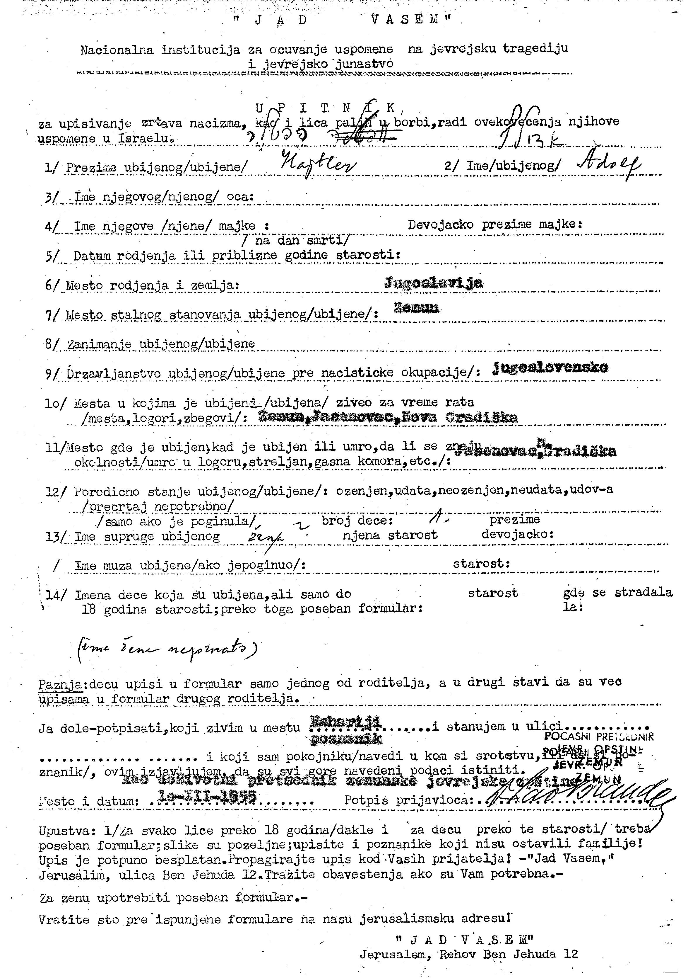 Hajtler Heftler Adolf Zemun, Yugoslavia Page of Testimony