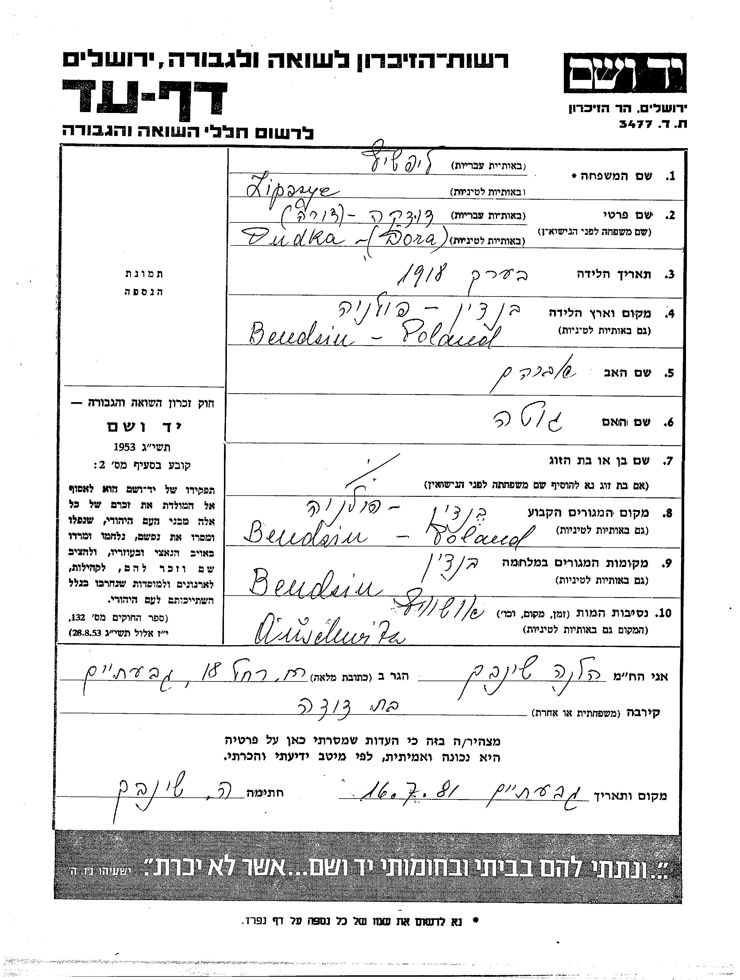 Dora Dudka Lipszyc was born in Bendin, Poland, 1918 to Avraham and Guta. Prior to WWII she lived in Bendin, Poland. During the war she was in Bendin, Poland. Dora Dudka was murdered in the Shoah. Place of death: Auschwitz, Poland.