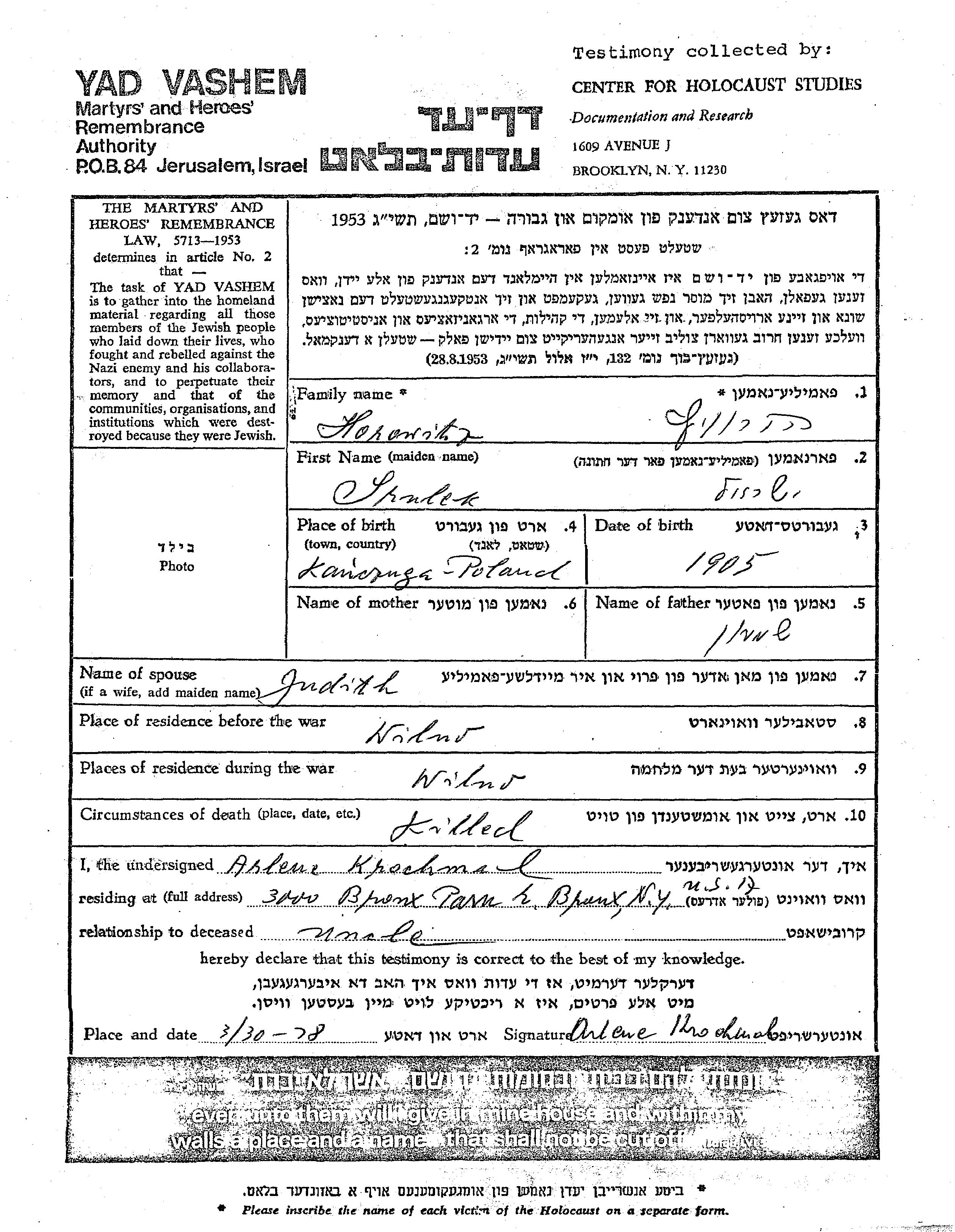 Horowitz Srulek 1905 Wilno, Poland Page of Testimony