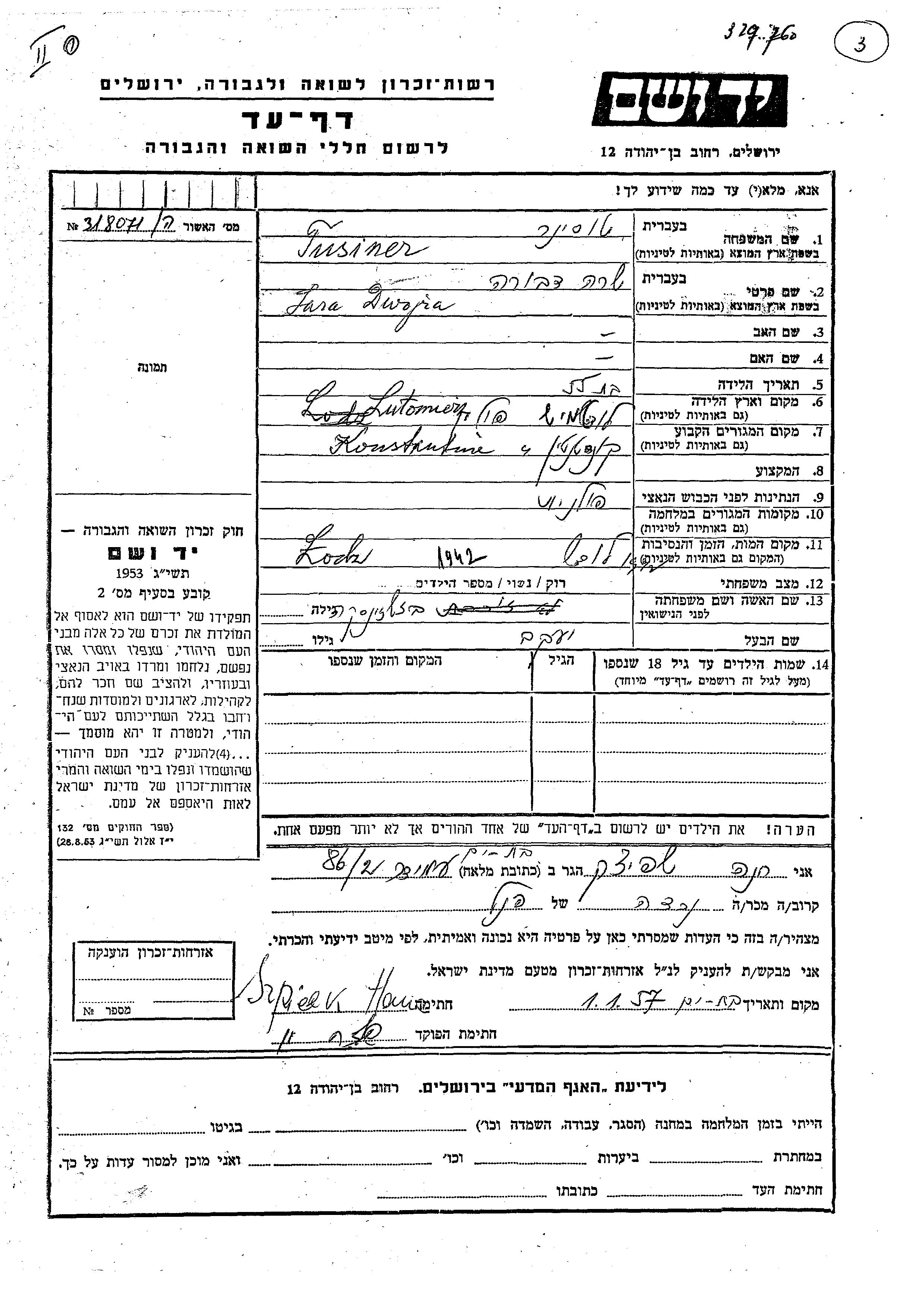 Dwojra Sara Tusiner nee Bzhezinska was born in Lutomiersk, Poland. She was married to Yaakov. Prior to WWII she lived in Konstantin, Poland. Dwojra Sara was murdered in the Shoah. Place of death: Lodz, Poland, 1942.