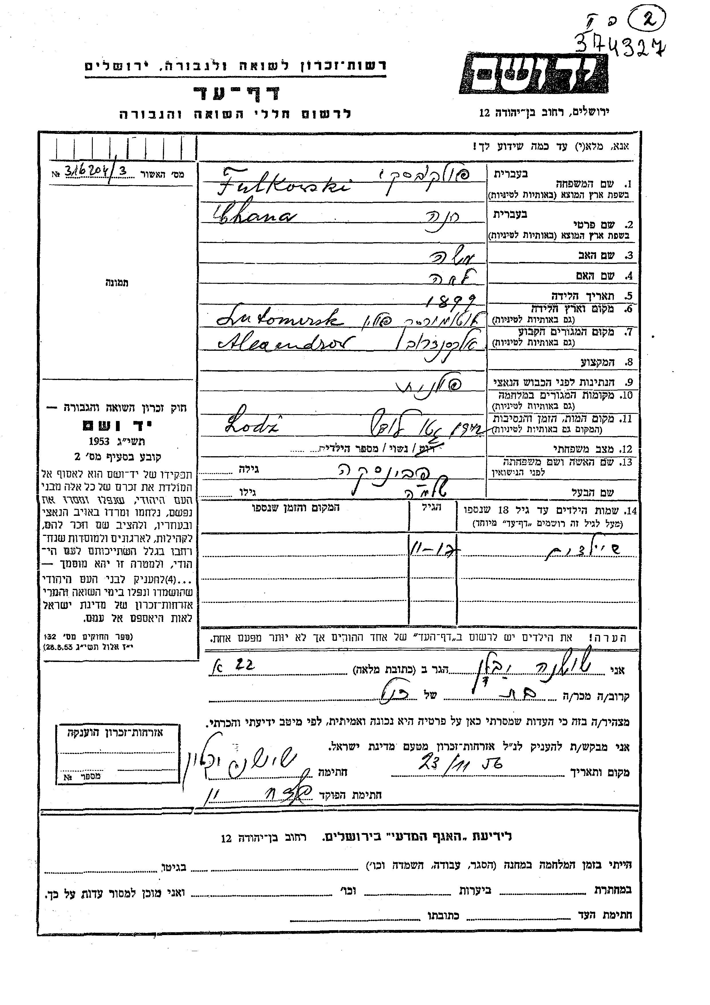 Chana Fulkowski nee Pabianska was born in Lutomiersk, Poland, 1899 to Moshe and Lea. She was married to Shlomo. Prior to WWII she lived in Alexandrow, Poland. Chana was murdered in the Shoah. Place of death: Lodz, Poland, 1942.