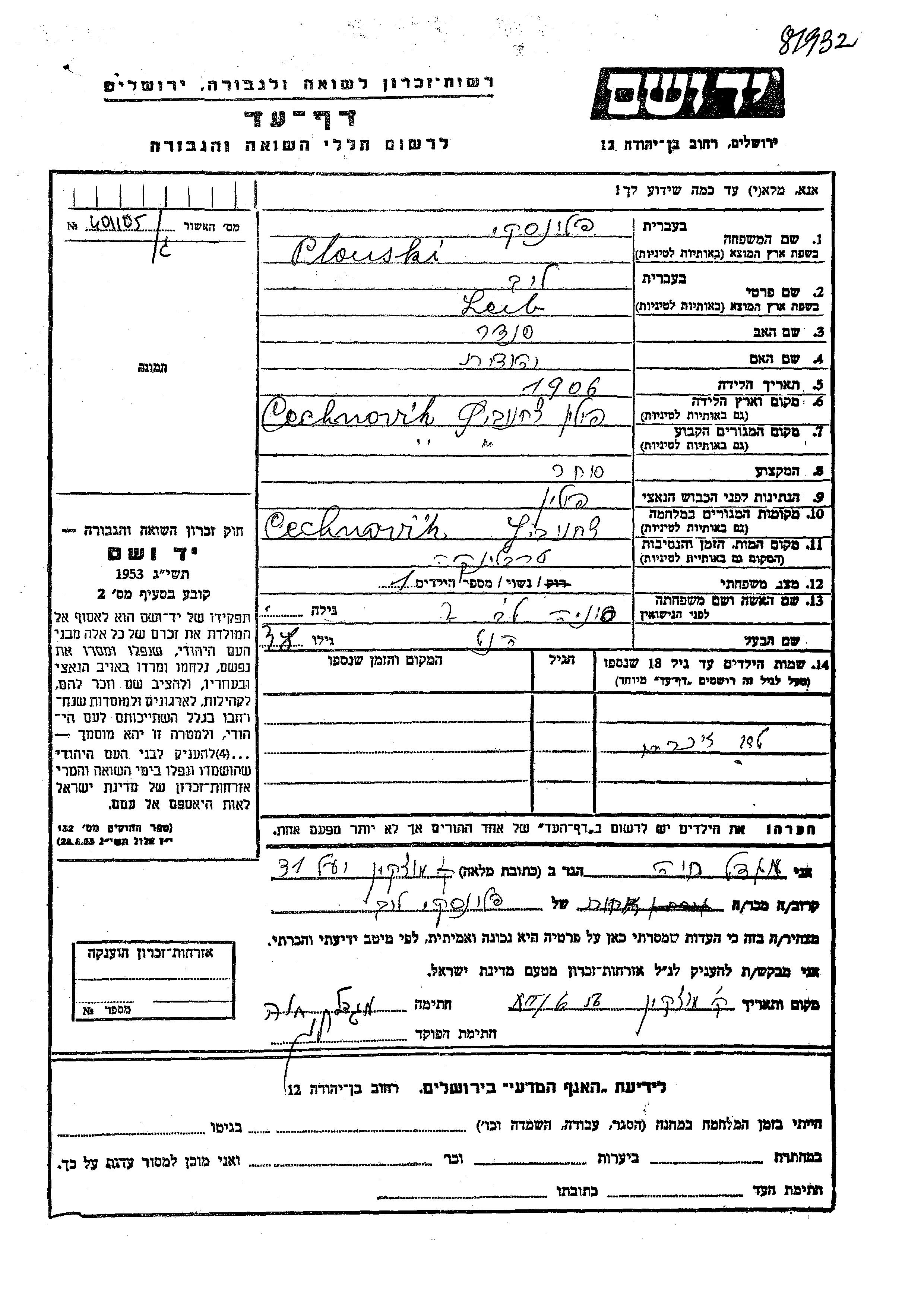 Leib Plonski was born in Ciechanoviec, Poland, 1906 to Sender and Yehudit. He was a merchant and married to Sonia. Prior to WWII he lived in Ciechanoviec, Poland. During the war he was in Ciechanoviec, Poland. Leib was murdered in the Shoah. Place of death: Treblinka, Poland.