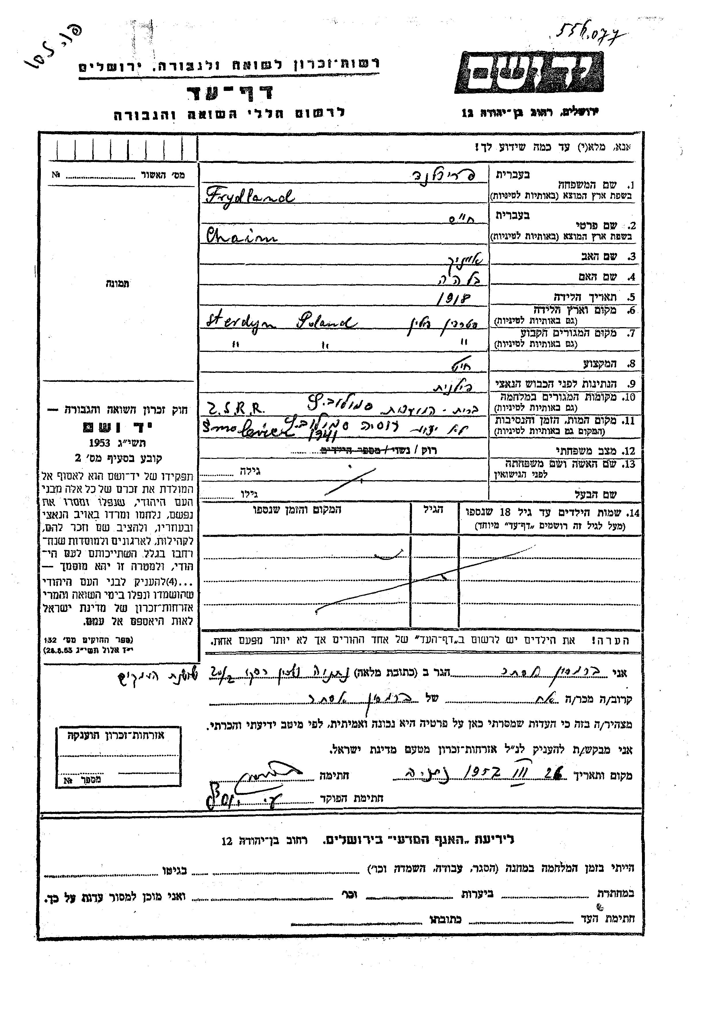 Chaim Frydland was born in Sterdyn, Poland, 1918 to Aizik and Bilha. He was a tailor and single. Prior to WWII he lived in Sterdyn, Poland. During the war he was in Smolevichi, Belorussia (USSR). Chaim was murdered in the Shoah. Place of death: Smolevichi, Belorussia (USSR), 1941.