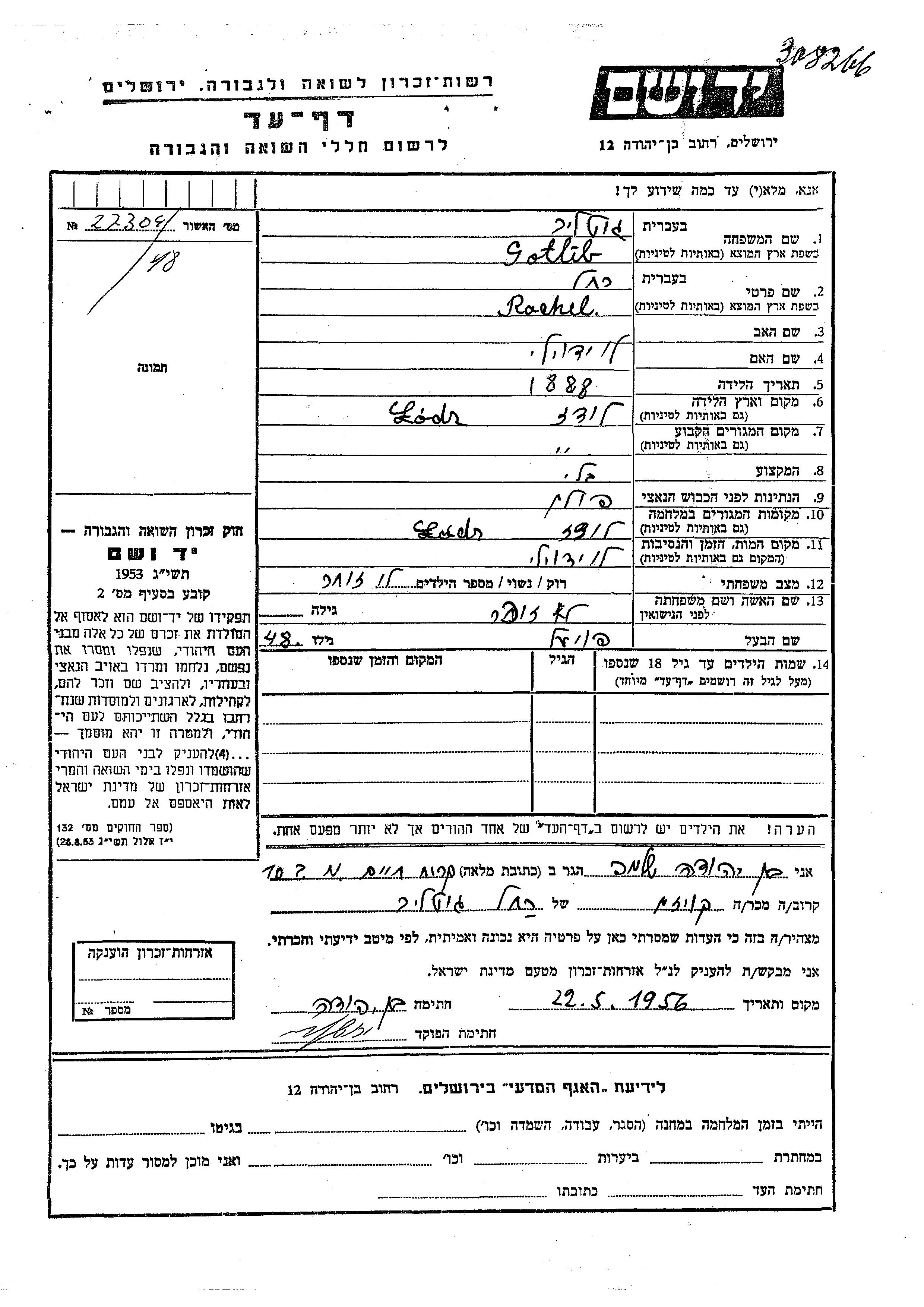 Rachel Gotlib was born in Lodz, Poland, 1888. She was married to Fuiel. Prior to WWII she lived in Lodz, Poland. During the war she was in Lodz, Poland. Rachel was murdered in the Shoah.