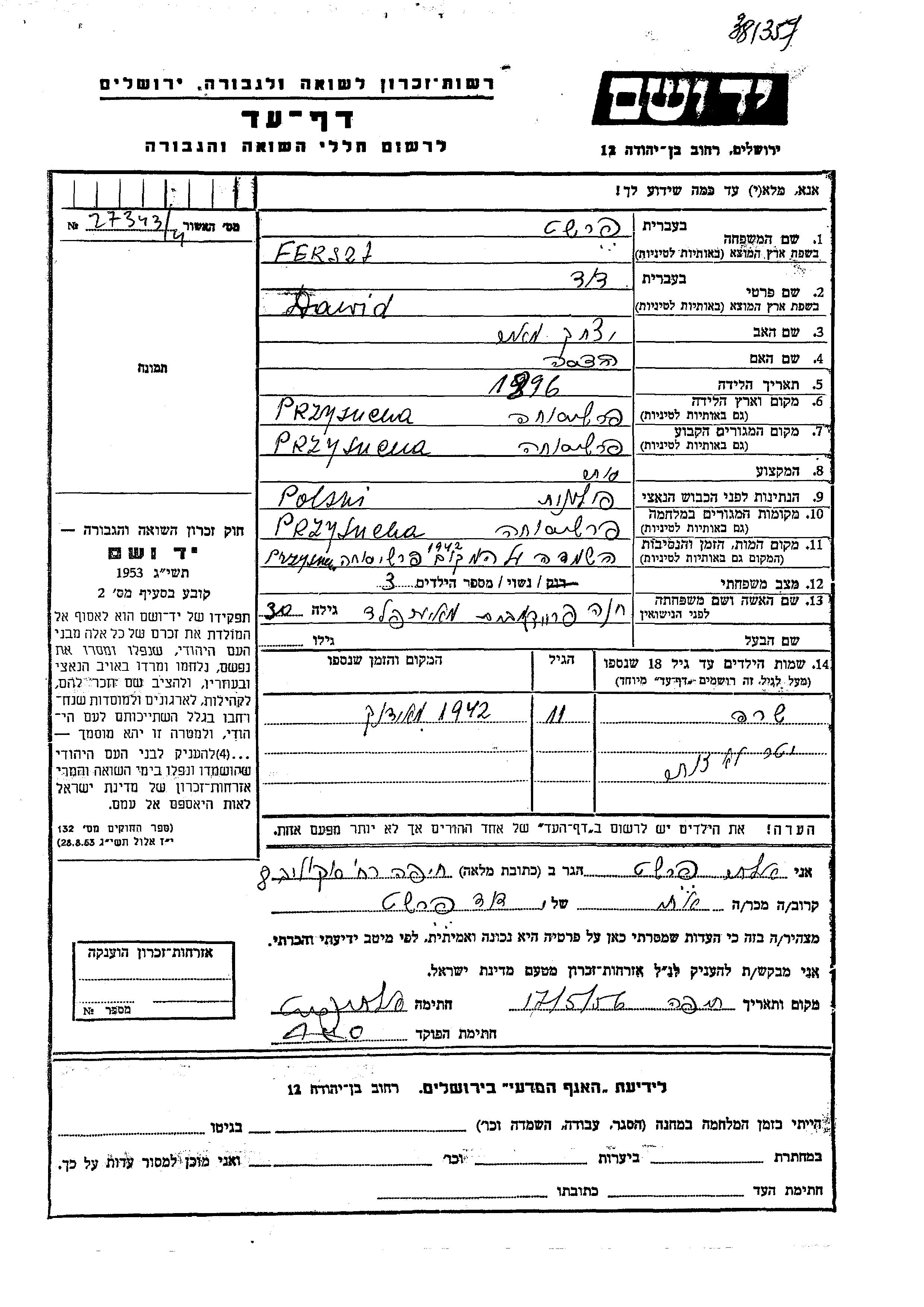 Dawid Ferszt was born in Przysucha, Poland, 1896 to Yitzkhak Meir and Hadasa. He was a merchant and married to Khana Freide nee Meierfeld. Prior to WWII he lived in Przysucha, Poland. During the war he was in Przysucha, Poland. Dawid was murdered in the Shoah. Place of death: Przysucha, Poland, 1942.