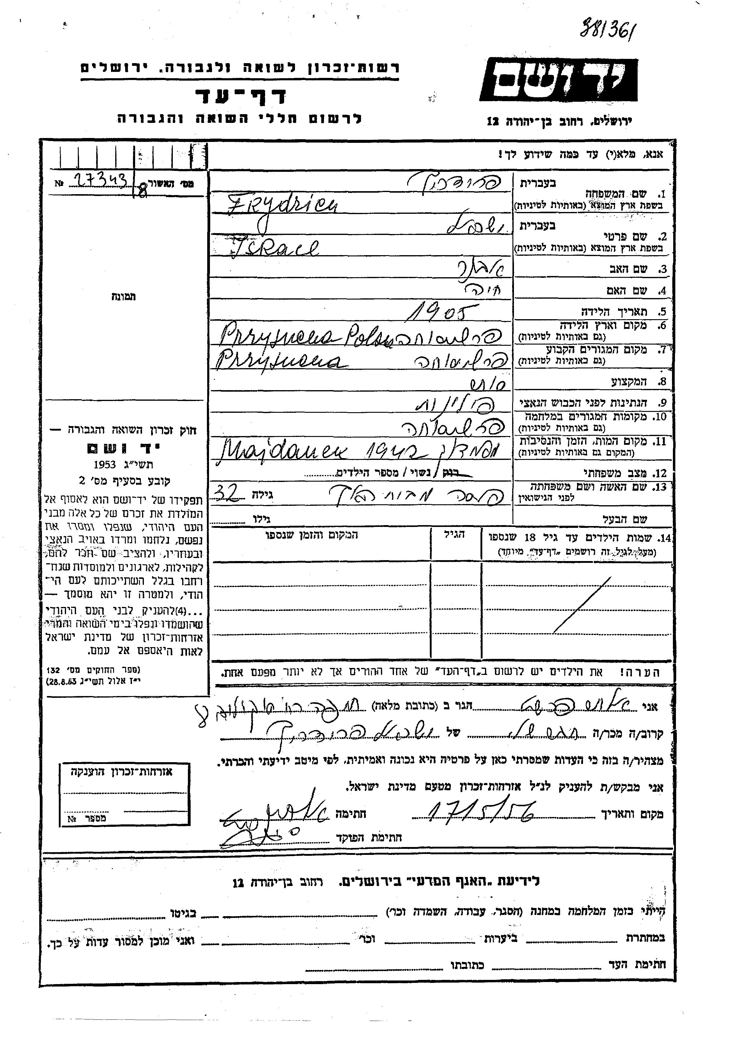 Israel Frydrich was born in Przysucha, Poland, 1905 to Avner and Khaia. He was a merchant and married to Pesa nee Hokh. Prior to WWII he lived in Przysucha, Poland. During the war he was in Przysucha, Poland. Israel was murdered in the Shoah. Place of death: Majdanek, Poland, 1942.