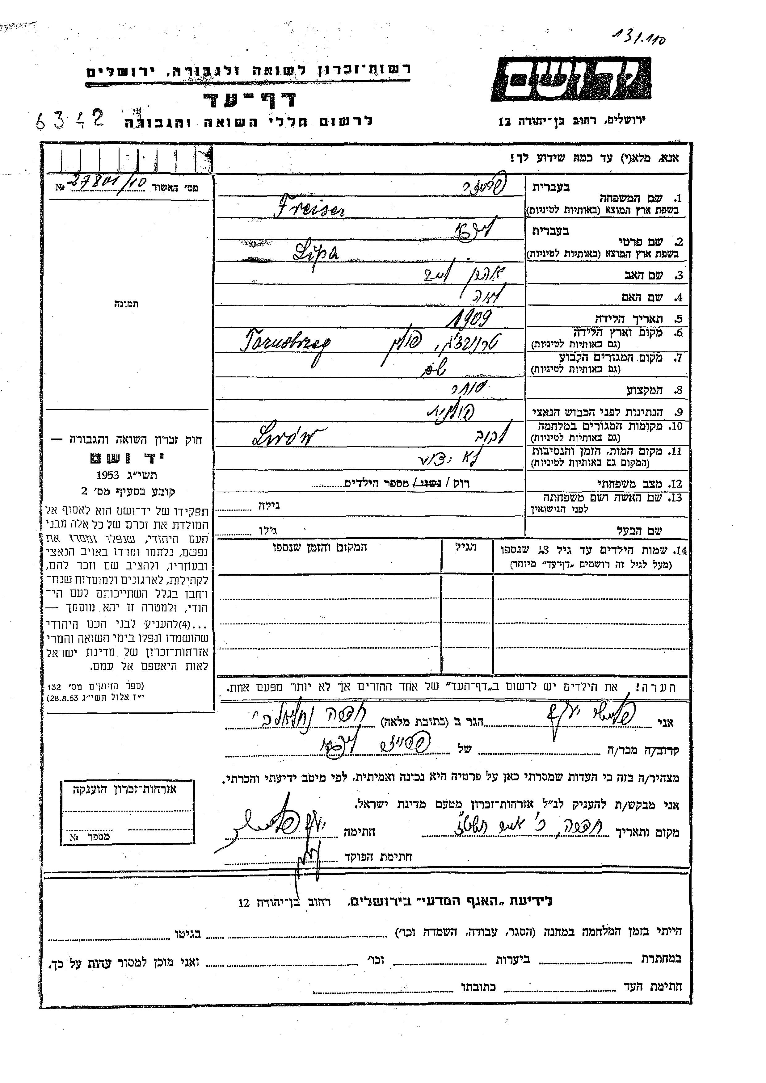 Lipa Freiser Freizer was born in Tarnobrzeg, Poland, 1909 to Aharon Leib and Lea. He was a merchant and single. Prior to WWII he lived in Tarnobrzeg, Poland. During the war he was in Lwow, Poland. Lipa was murdered in the Shoah.