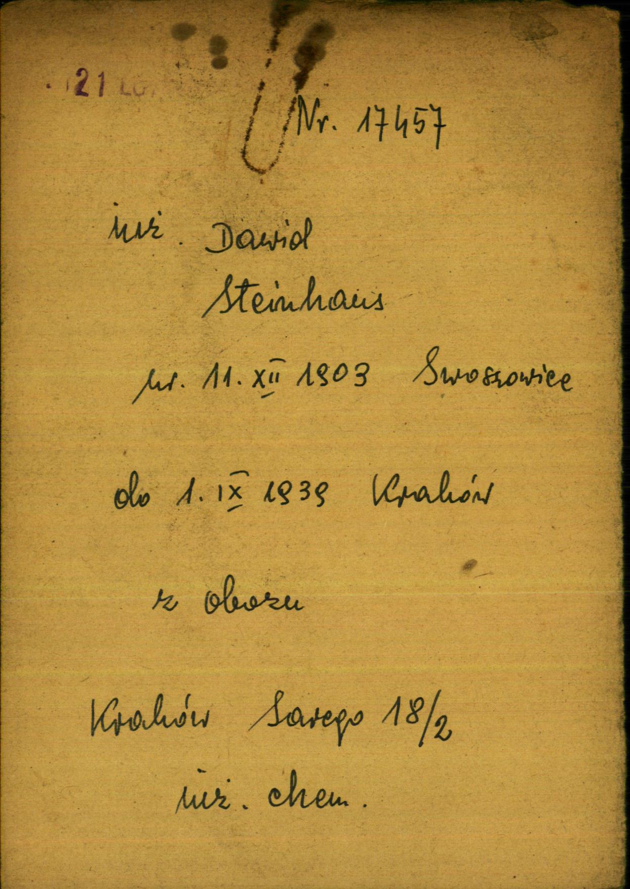 Engineer Dawid Steinhaus was born in Swoszowice, Poland, 1903. He was a chemik. Prior to WWII he lived in Krakow, Poland. During the war he was in Camp. Engineer Steinhaus survived the Shoah.