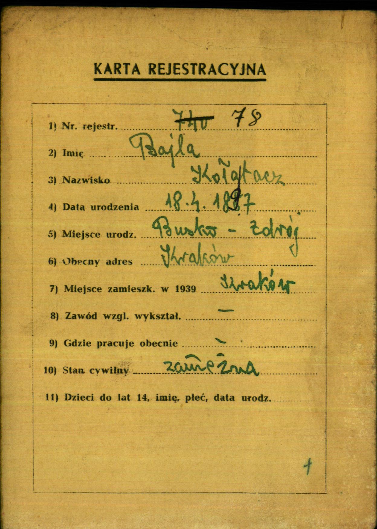 Bajla Kolatacz was born in Busko Zdroj, Poland, 1897. She was married. Prior to WWII she lived in Krakow, Poland.