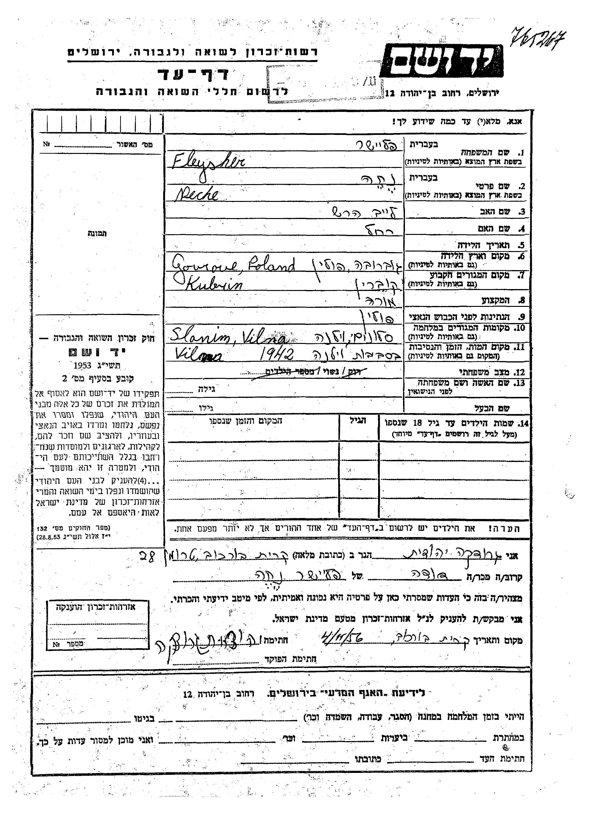 Neche Fleysher was born in Goworowo, Poland to Leib Hersh and Rakhel. She was a teacher and married. Prior to WWII she lived in Kubrin, Poland. During the war she was in Vilna, Poland. Neche was murdered in the Shoah. Place of death: Vilna, Poland, 1942.