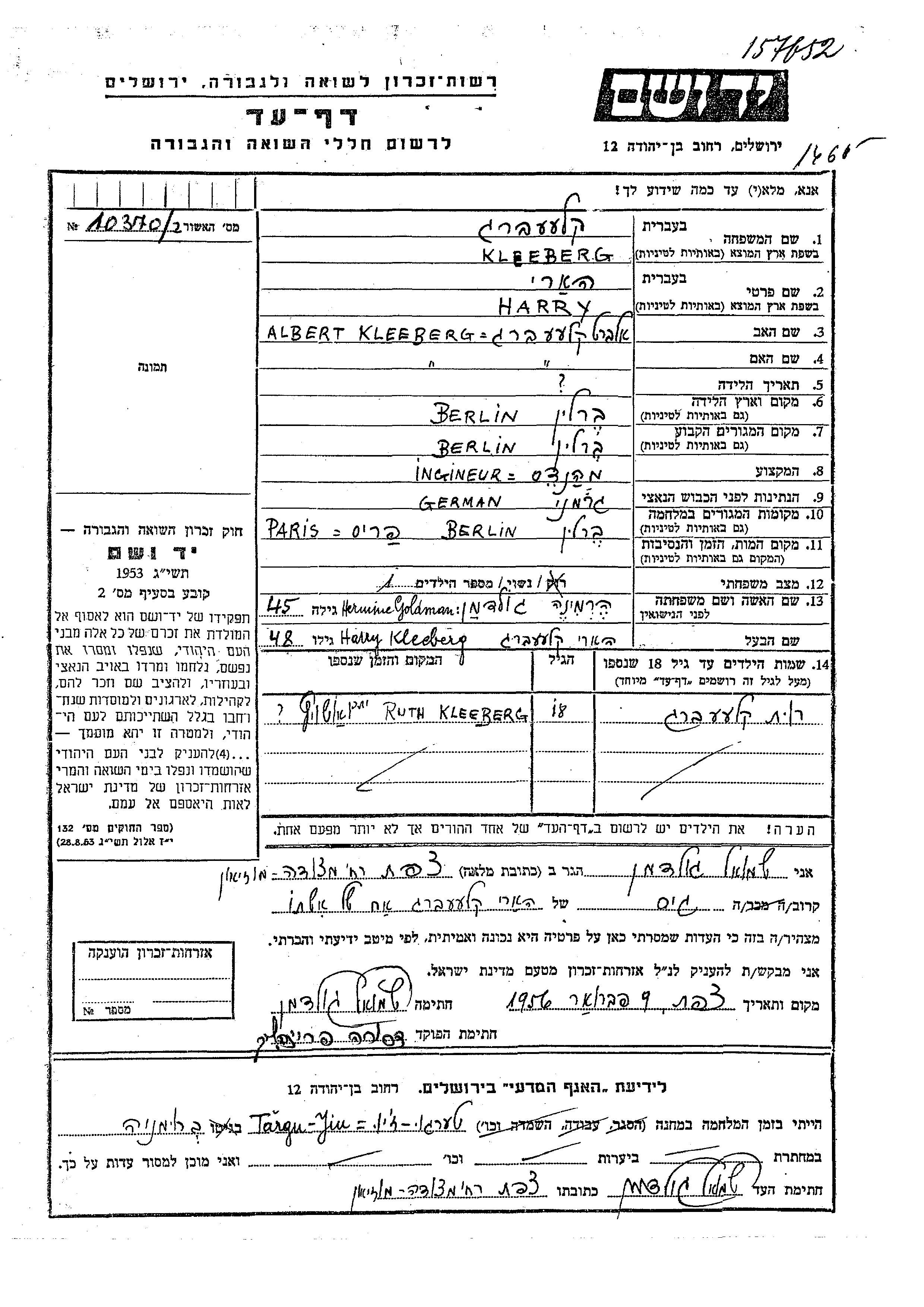 Kleeberg Harry Berlin, Germany Page of Testimony