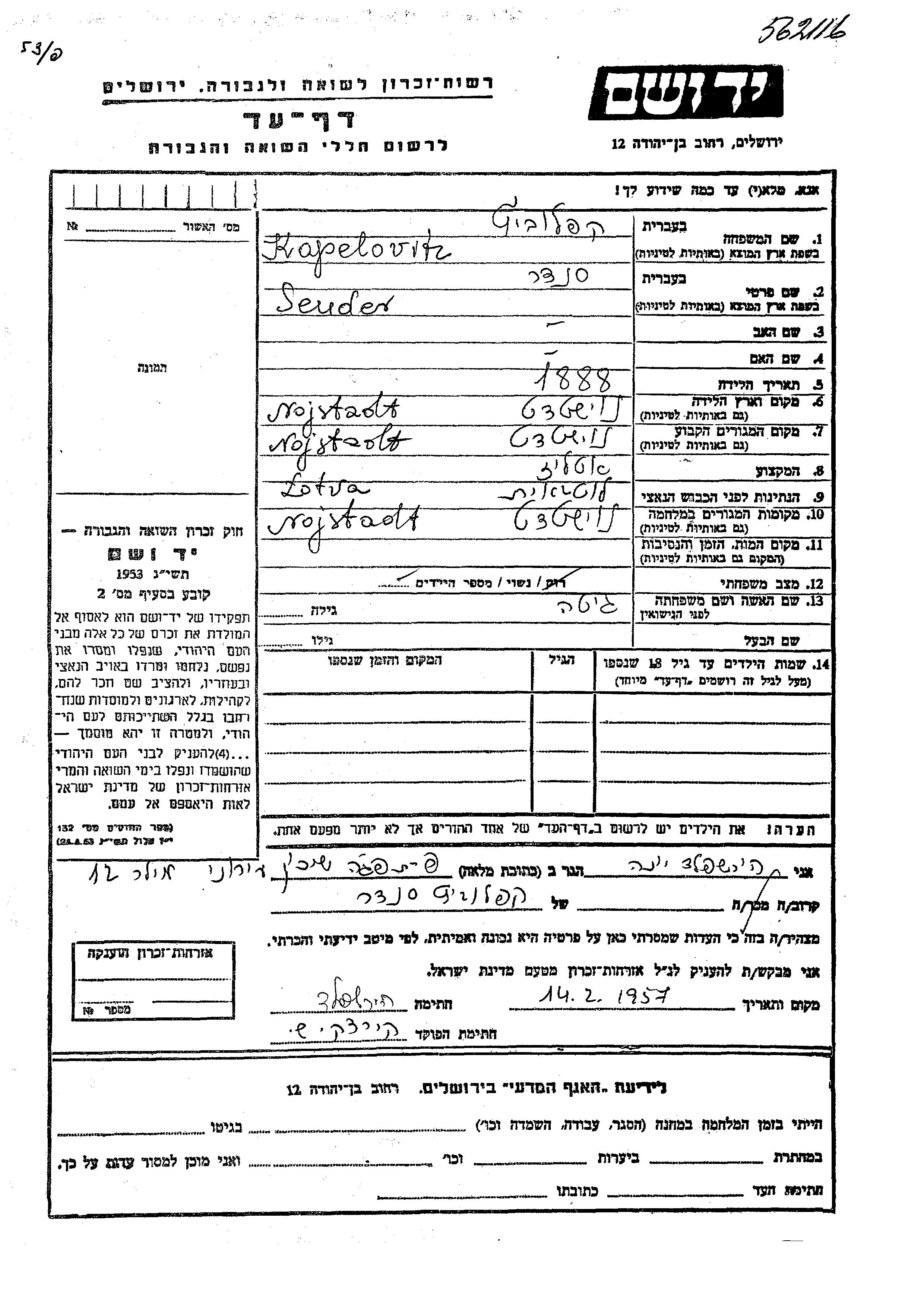 Sender Kapelovitz was born in Neustadt, Lithuania, 1888. He was married to Gita. Prior to WWII he lived in Neustadt, Lithuania. During the war he was in Neustadt, Lithuania. Sender was murdered in the Shoah.