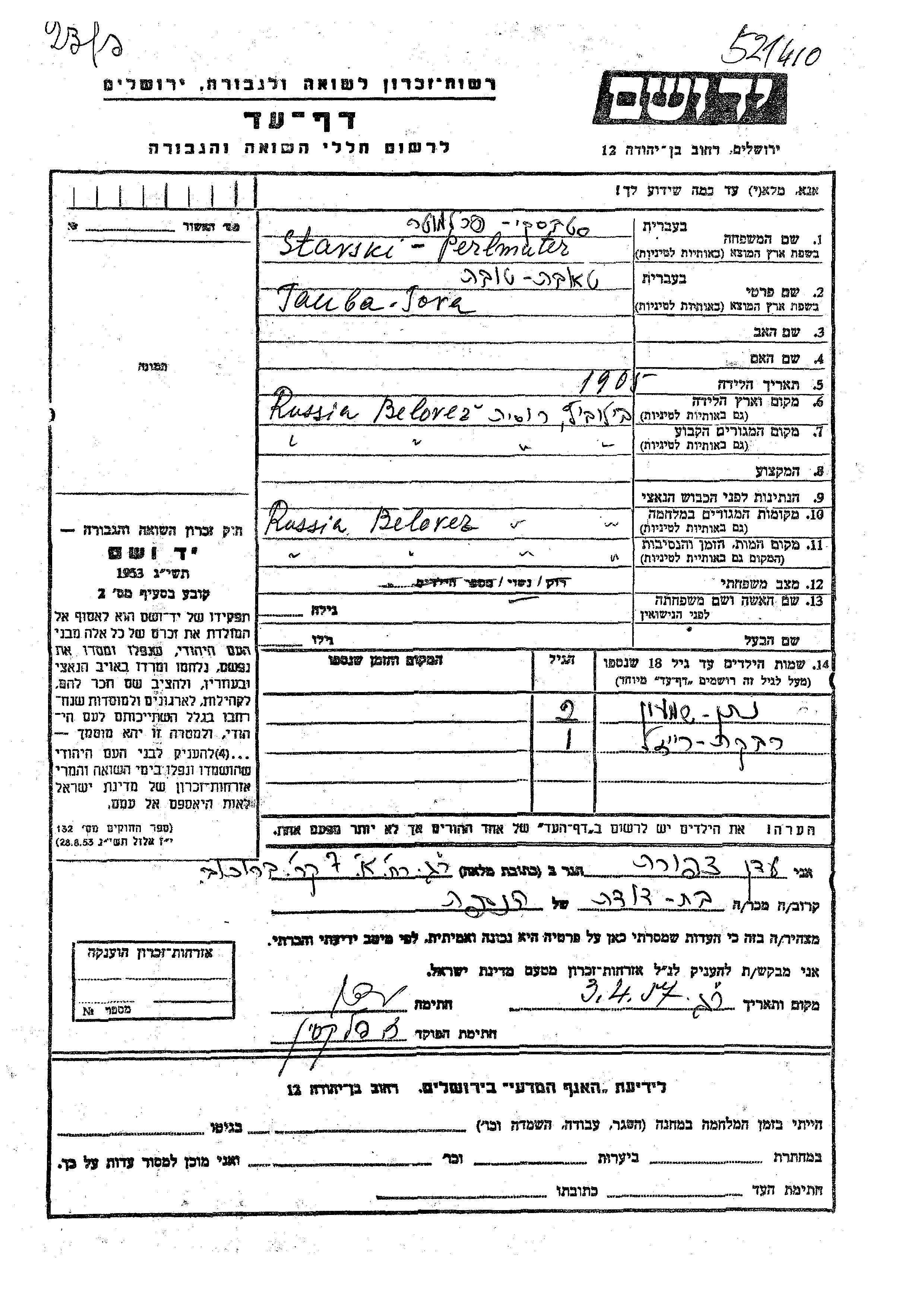 Tauba Tova Stavski Perlmuter was born in Bialowieza, Poland, 1905. She was married. Prior to WWII she lived in Bialowieza, Poland. During the war she was in Bialowieza, Poland. Tauba Tova was murdered in the Shoah. Place of death: Bialowieza, Poland.