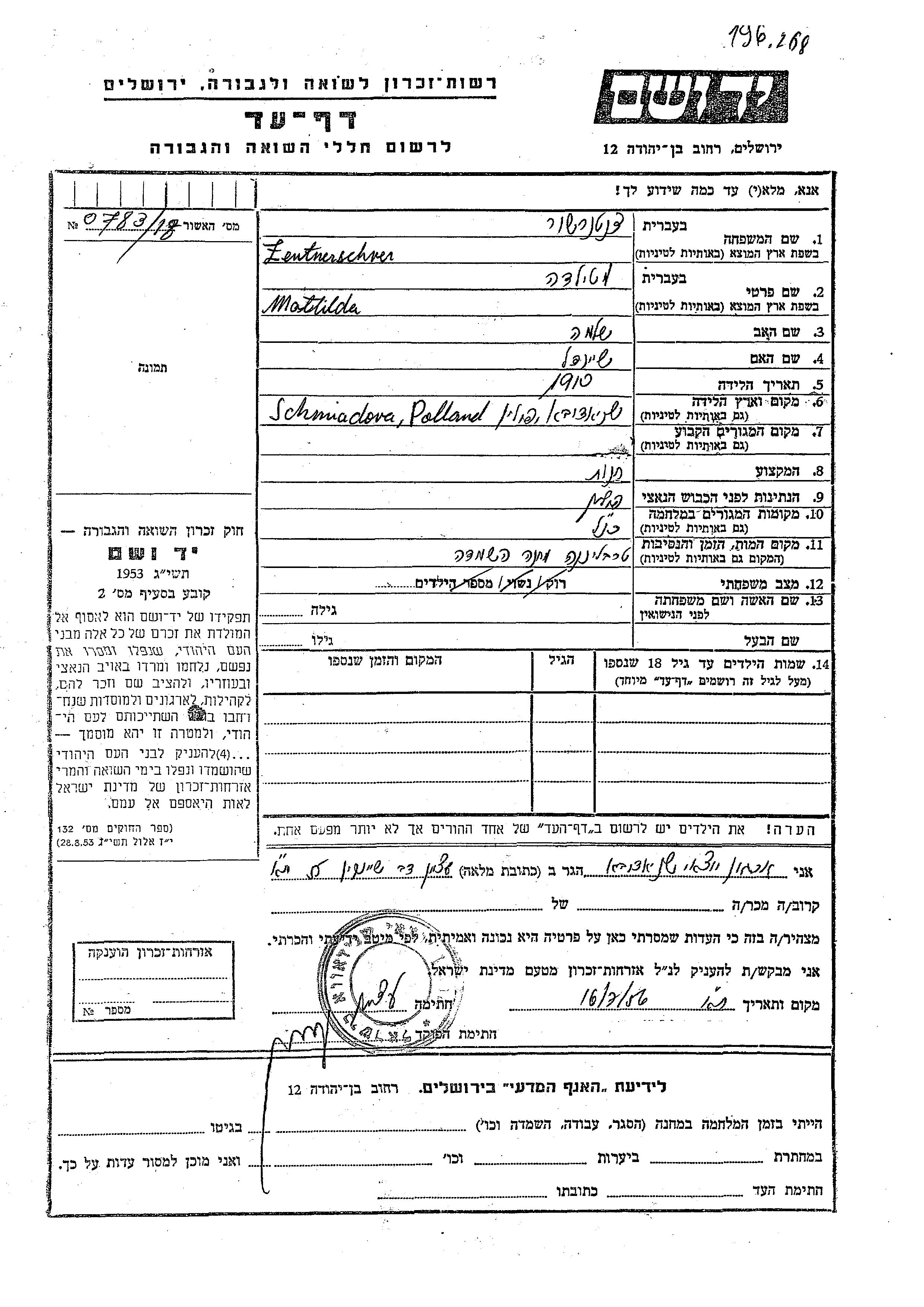Mathilda Zentnerschver was born in Sniadow, Poland, 1910 to Shlomo and Sheindl. During the war she was in Sniadow, Poland. Mathilda was murdered in the Shoah. Place of death: Treblinka, Poland.
