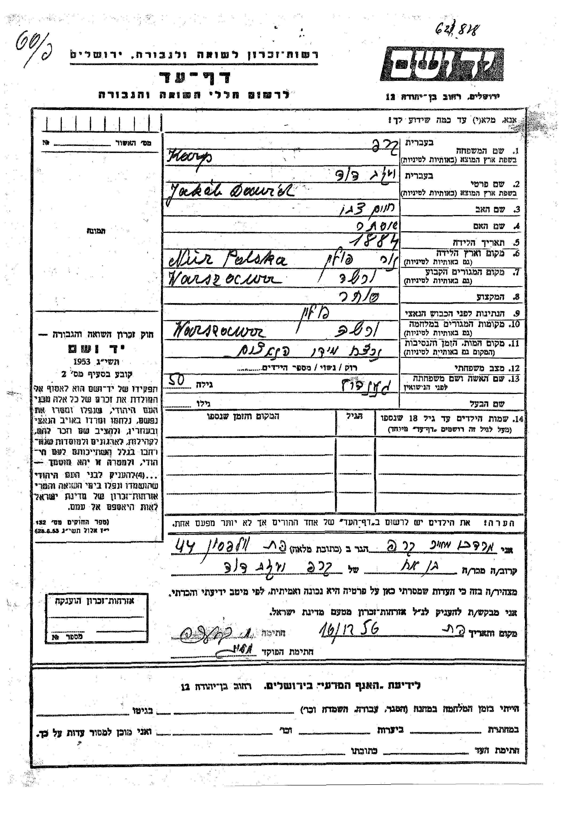 Yakob Dawid Karp was born in Nur, Poland, 1884 to Khaim Tzvi and Ester. He was a merchant and married to Genendil. Prior to WWII he lived in Warszawa, Poland. During the war he was in Warszawa, Poland. Yakob Dawid was murdered in the Shoah.