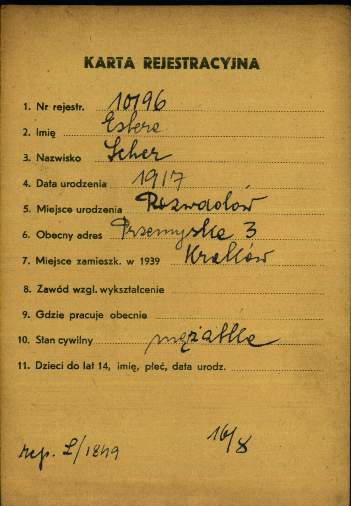 Estera Scher was born in Rozwadów, Poland, 1917. She was married. Prior to WWII she lived in Krakow, Poland.