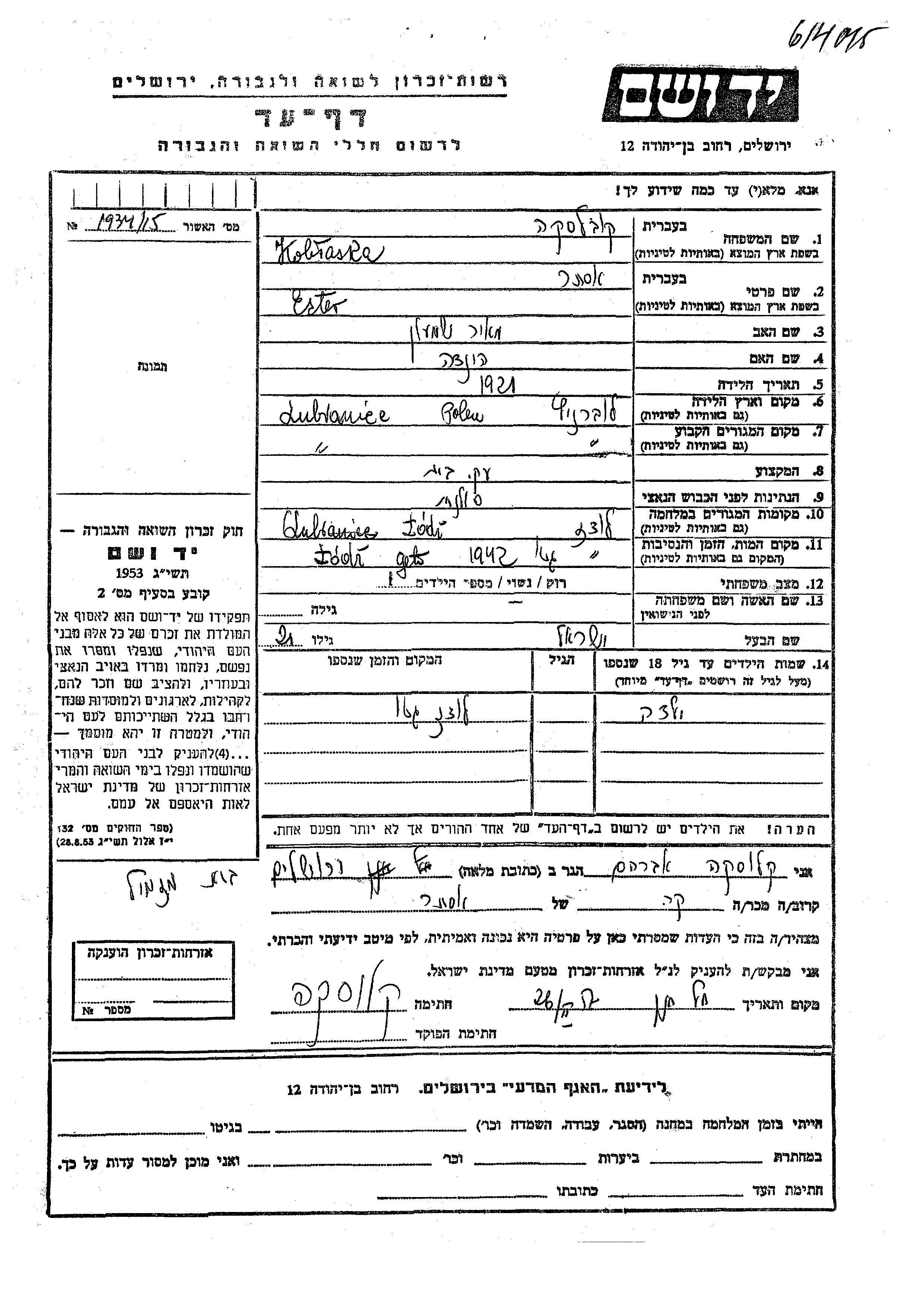 Ester Kovalska was born in Lubraniec, Poland, 1921 to Meir Shimon and Hinda. She was a housewife and married to Yisrael. Prior to WWII she lived in Lubraniec, Poland. During the war she was in Lodz, Poland. Ester was murdered in the Shoah. Place of death: Lodz, Poland, 1942.
