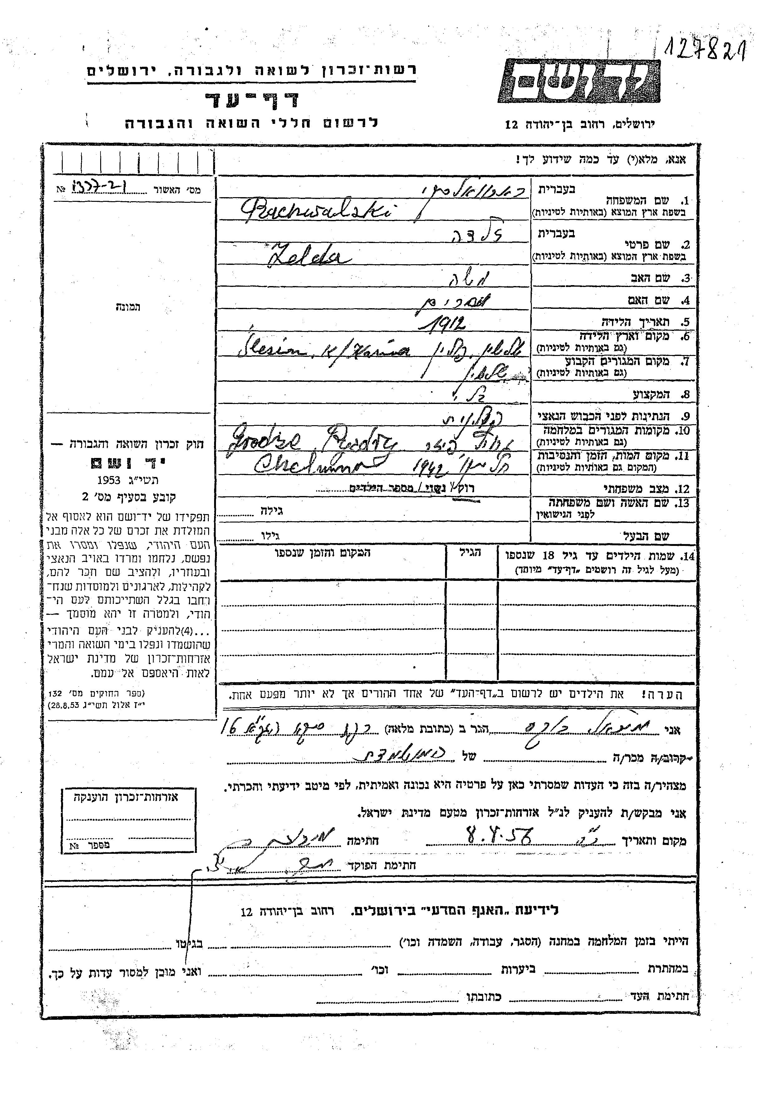 Zelda Rachwalski was born in Slesin, Poland, 1912 to Moshe and Miriam. She was a without profession and single. Prior to WWII she lived in Slesin, Poland. During the war she was in Pyzdry, Poland. Zelda was murdered in the Shoah. Place of death: Chelmno, Poland, 1942.