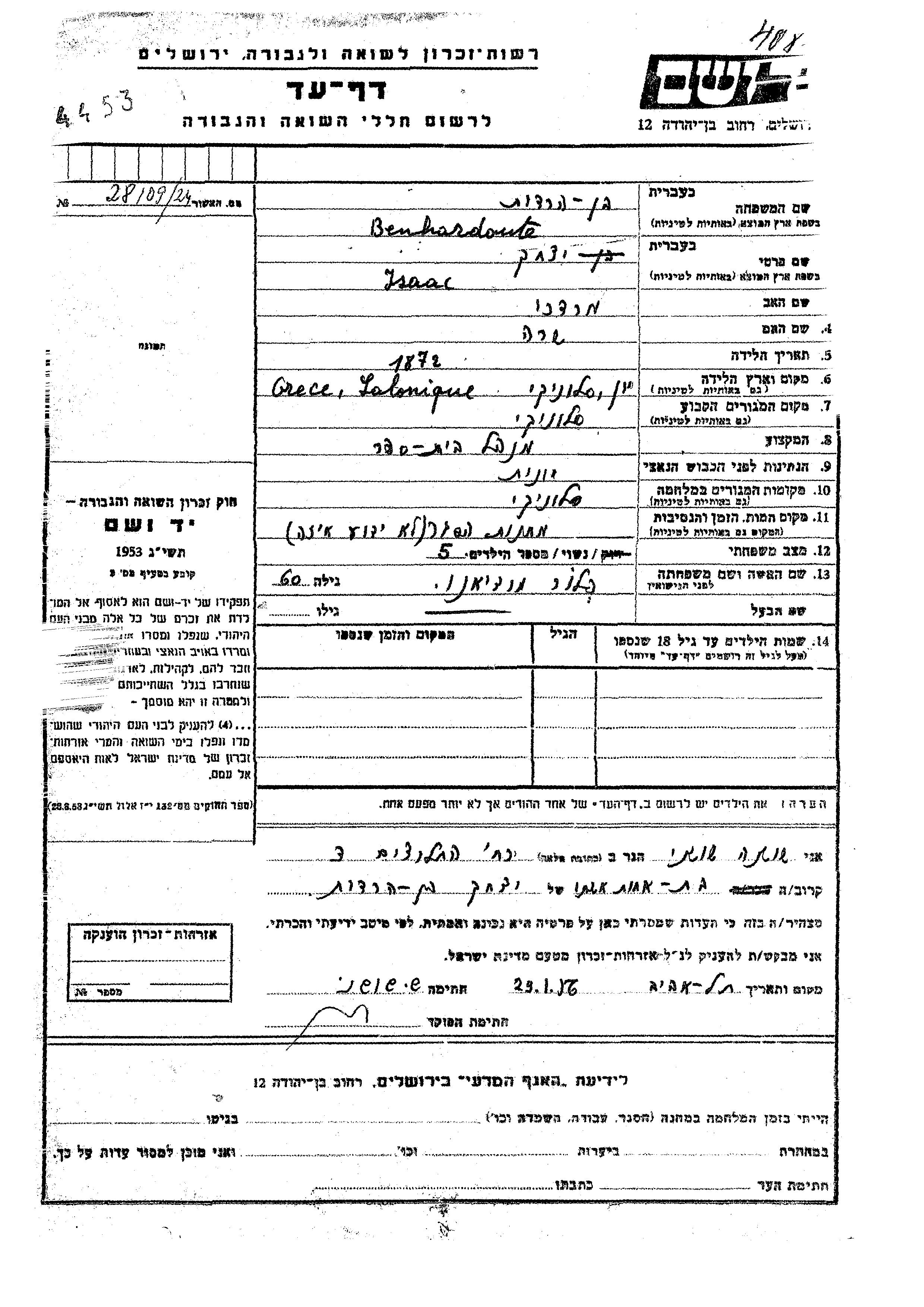 Benhardoute Isaac 1872 Saloniki, Greece Page of Testimony