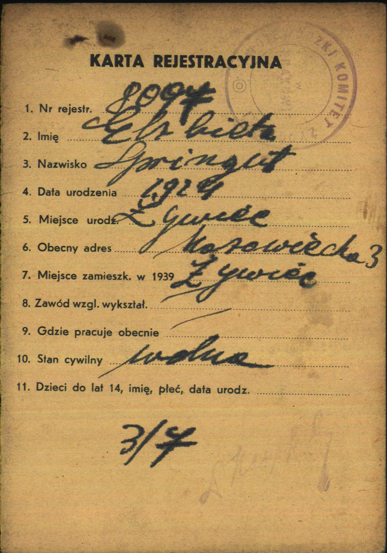 Elzbieta Springut was born in Zywiec, Poland, 1924. She was a widow. Prior to WWII she lived in Zywiec, Poland.