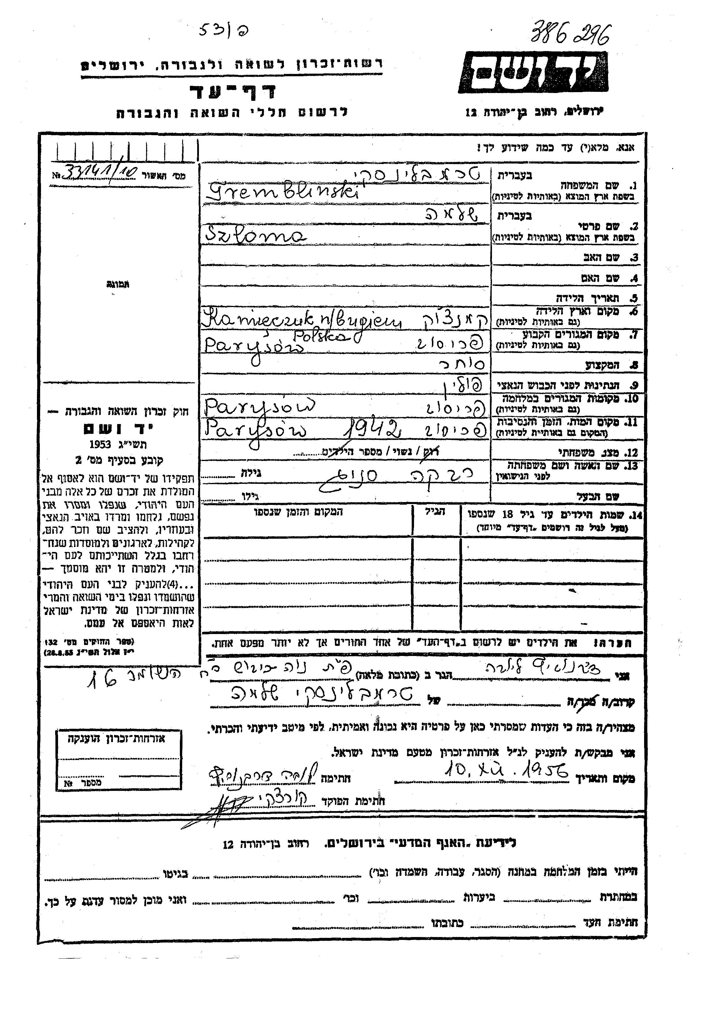 Szlomo Tremblinski was born in KAMIENCZYK NAD BUGIEM, Poland. He was a merchant and married to Rivka nee Snieg. Prior to WWII he lived in Parysow, Poland. During the war he was in Parysow, Poland. Szlomo was murdered in the Shoah. Place of death: Parysow, Poland, 1942.