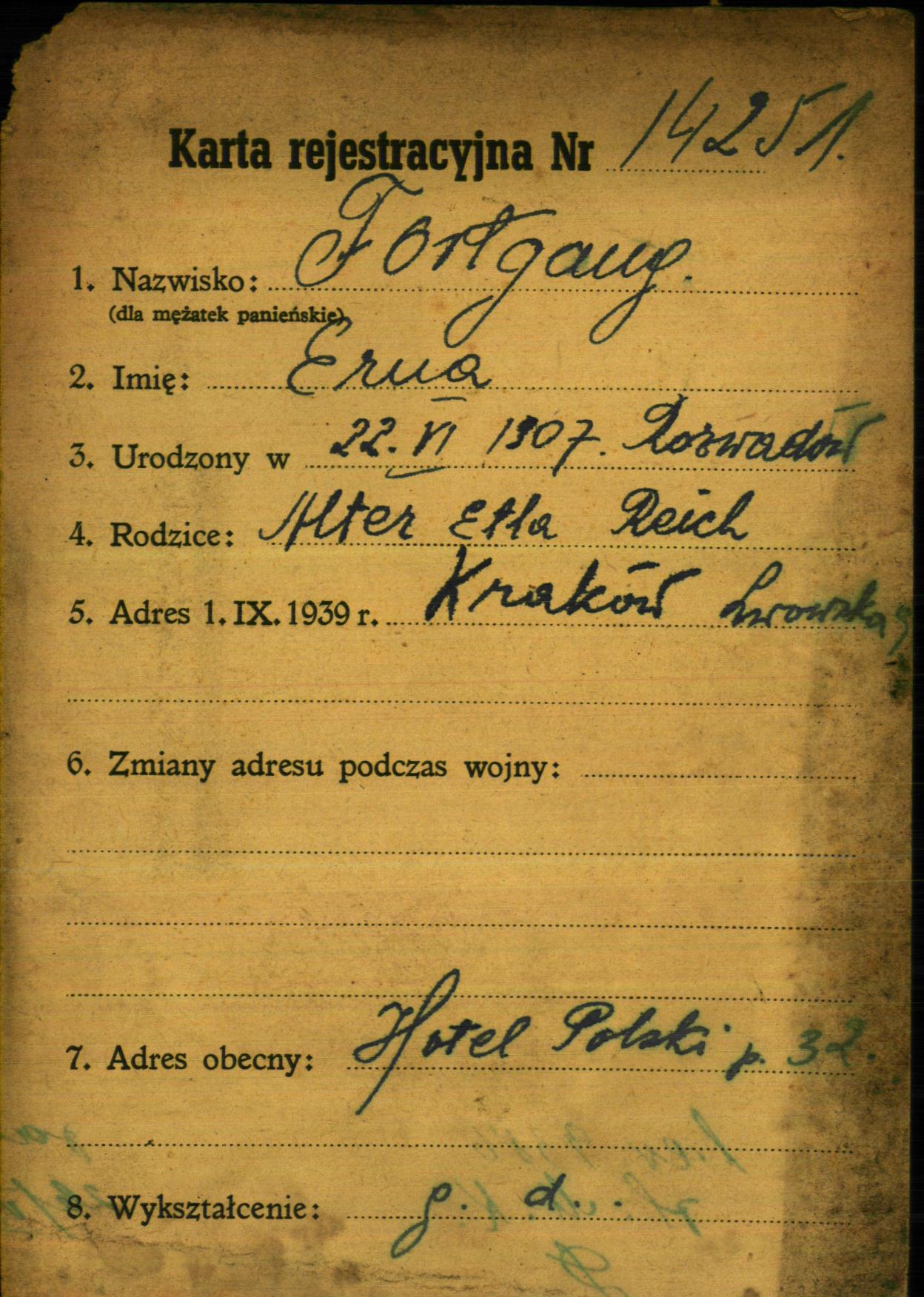 Erna Fortgang was born in Rozwadów, Poland, 1907 to Alter and Etla. She was a housewife. Prior to WWII she lived in Krakow, Poland.