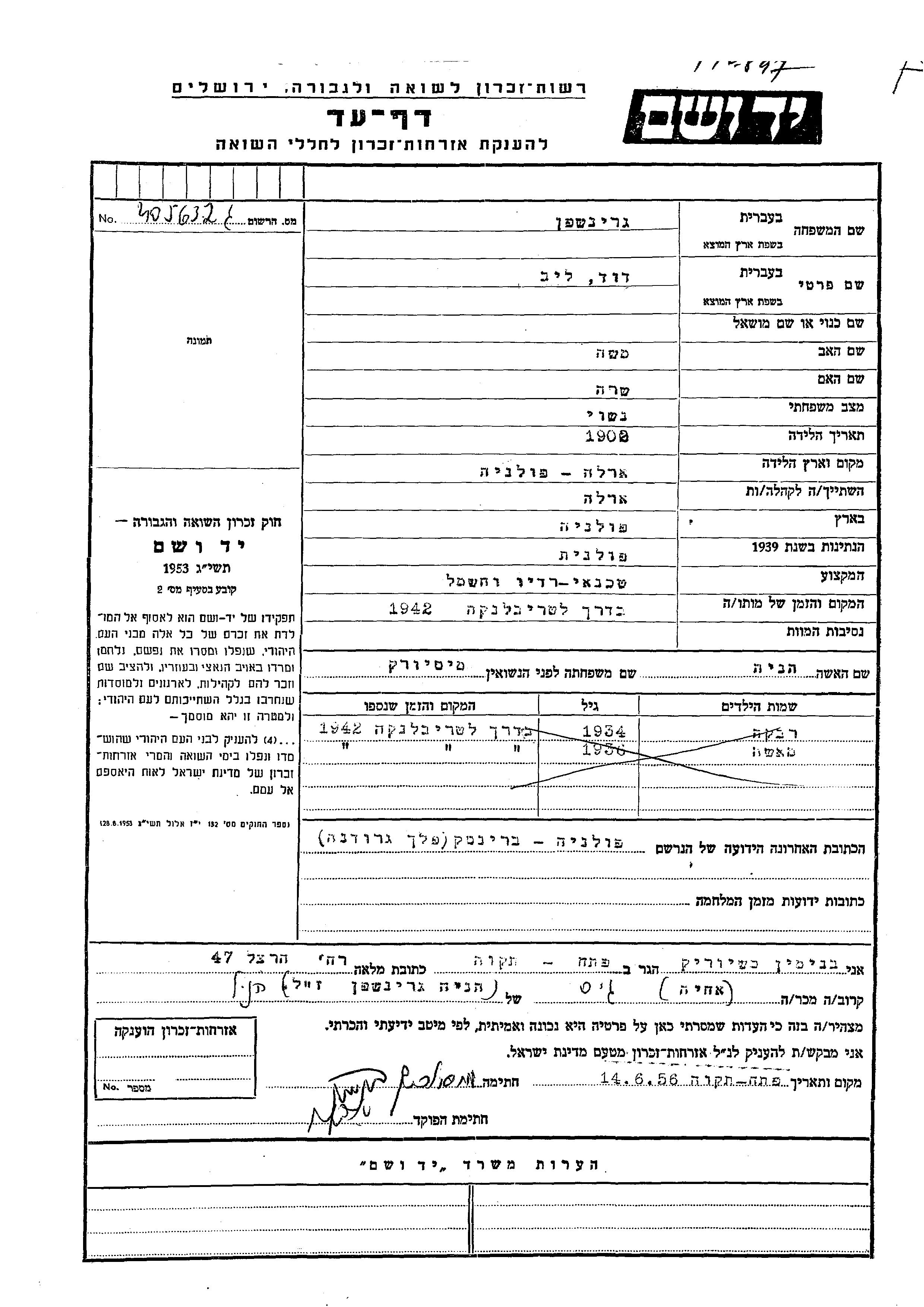 David Leib Grinshpan was born in Orla, Poland, 1902 to Moshe and Sara. He was a technician and married to Henia nee Misiorik. Prior to WWII he lived in Orla, Poland. During the war he was in Brzesc, Poland. David Leib was murdered in the Shoah. Place of death: Treblinka, Poland, 1942.