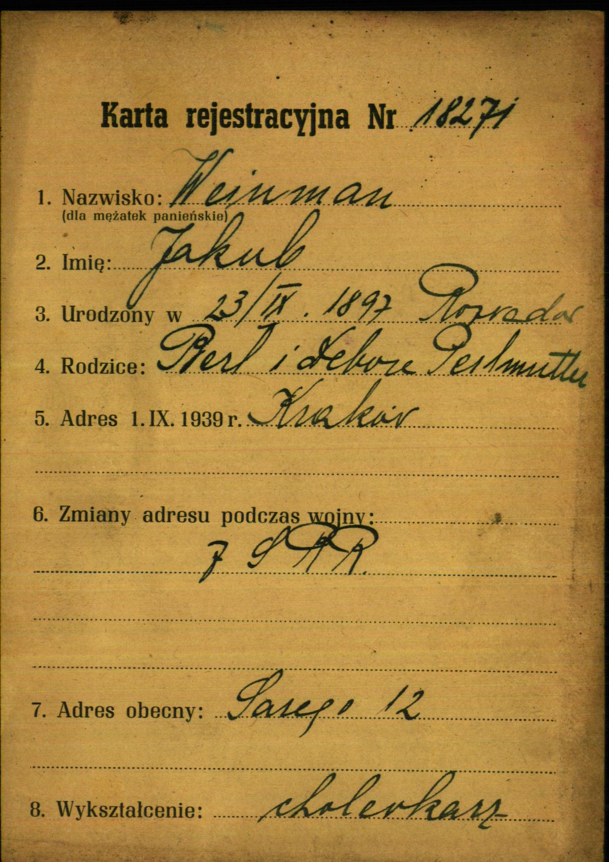 Jakub Weinman was born in Rozwadów, Poland, 1897 to Berl and Debora. He was a bootleg cutter. Prior to WWII he lived in Krakow, Poland. During the war he was in Soviet Union. Jakub survived the Shoah.