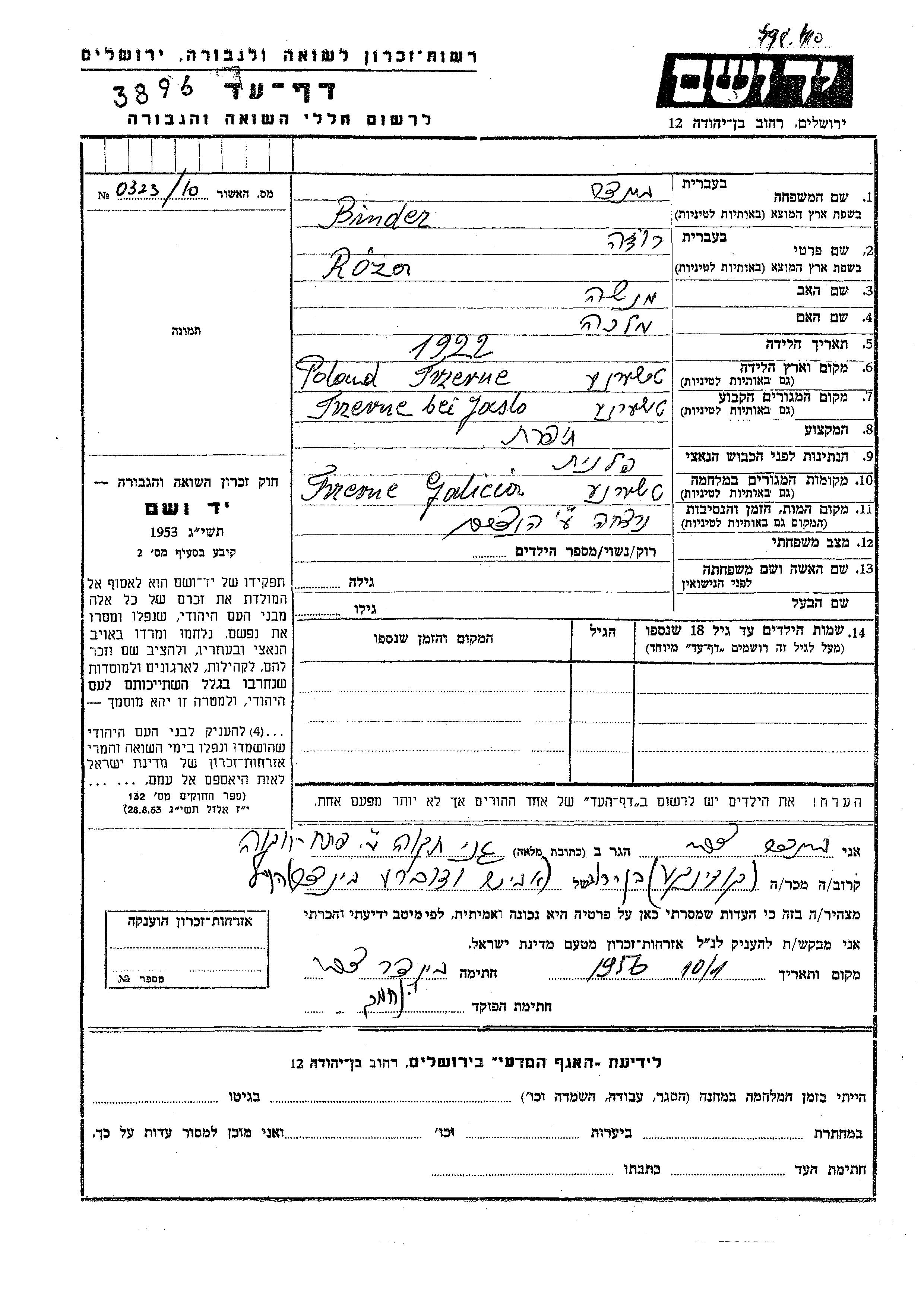 Binder Roza 1922 Trzerne, Poland Page of Testimony