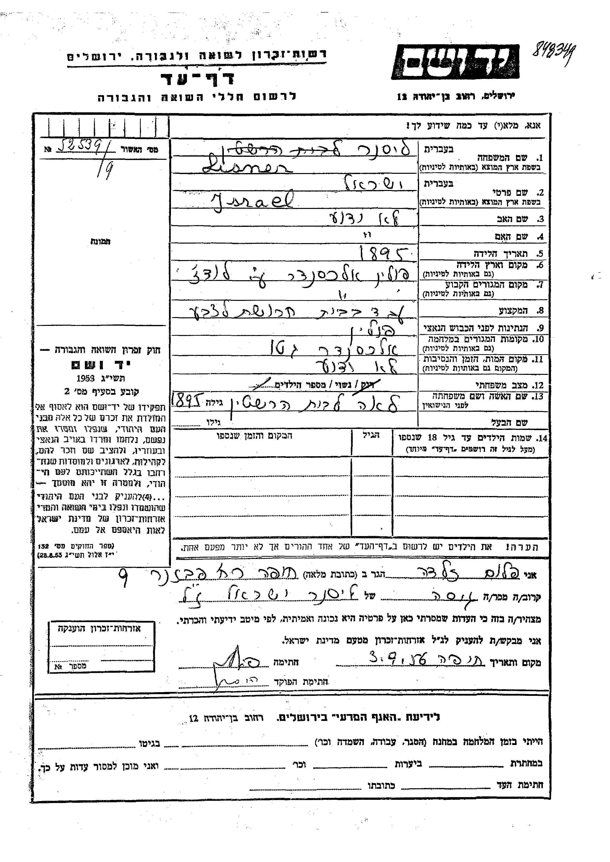 Israel Lisner was born in Aleksandrow Lodzki, Poland, 1895. He was a paint factory and married to Lea nee Hershtein. Prior to WWII he lived in Aleksandrow Lodzki, Poland. During the war he was in Aleksandrow Lodzki, Poland. Israel was murdered in the Shoah.
