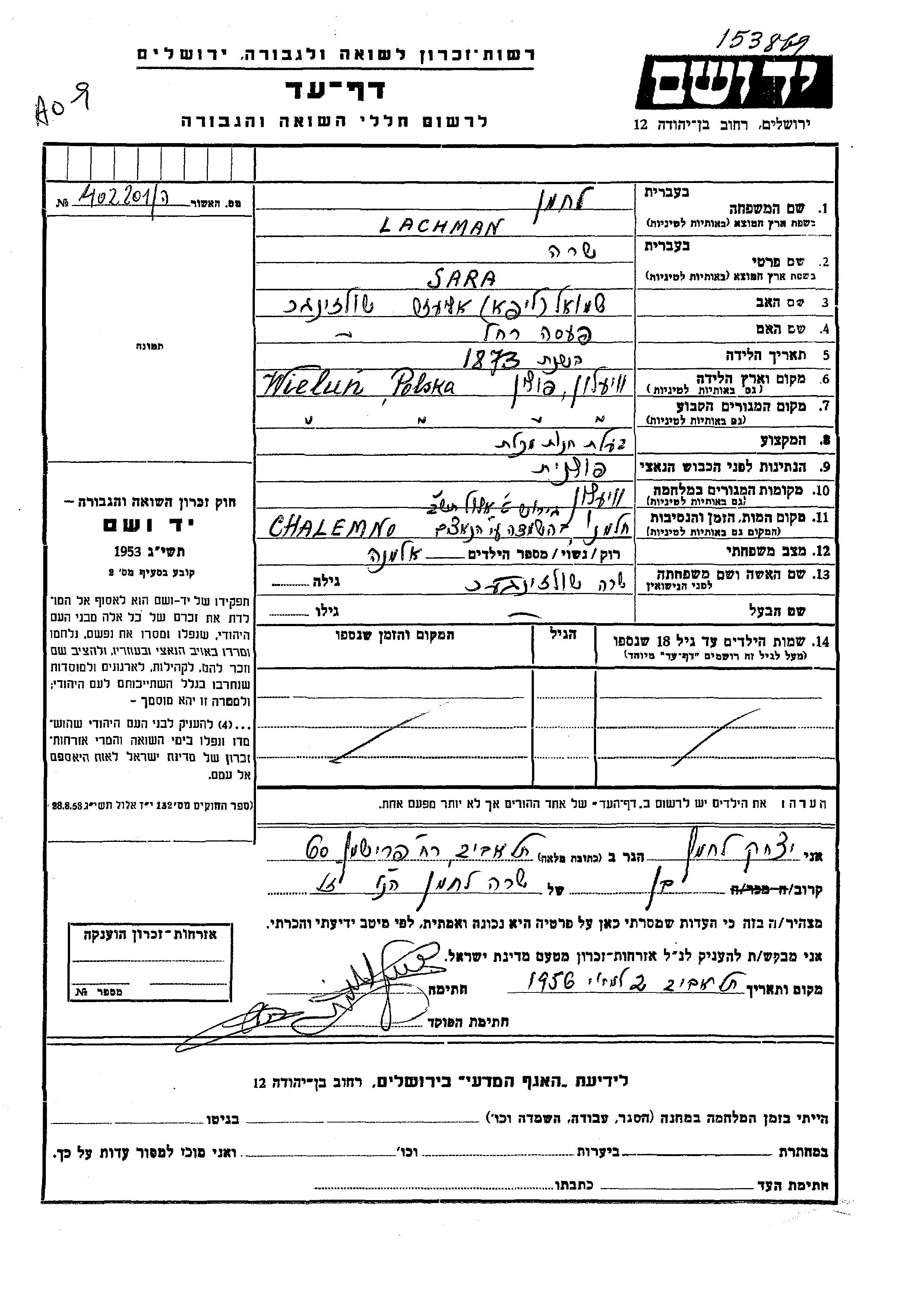 Lachman Sara 1873 Wielun, Poland Page of Testimony