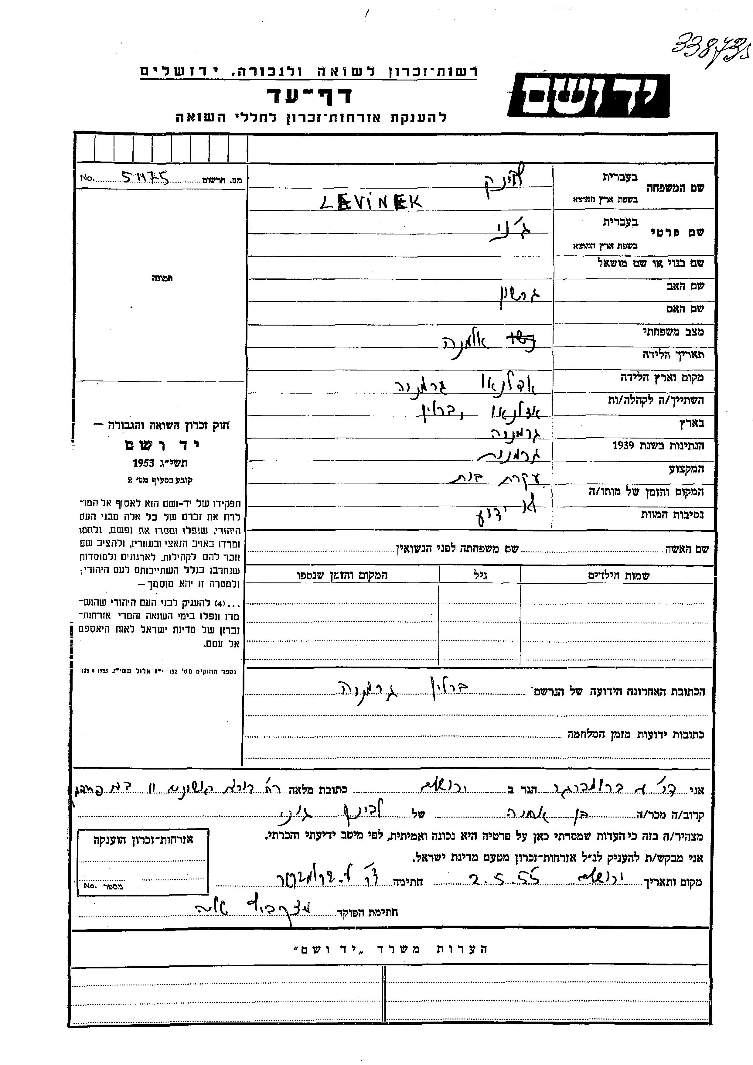 Zheni Levinek was born in Adelnau, Poland to Gershon. She was a housewife and a widow. Prior to WWII she lived in Berlin, Germany. During the war she was in Berlin, Germany. Zheni was murdered in the Shoah.