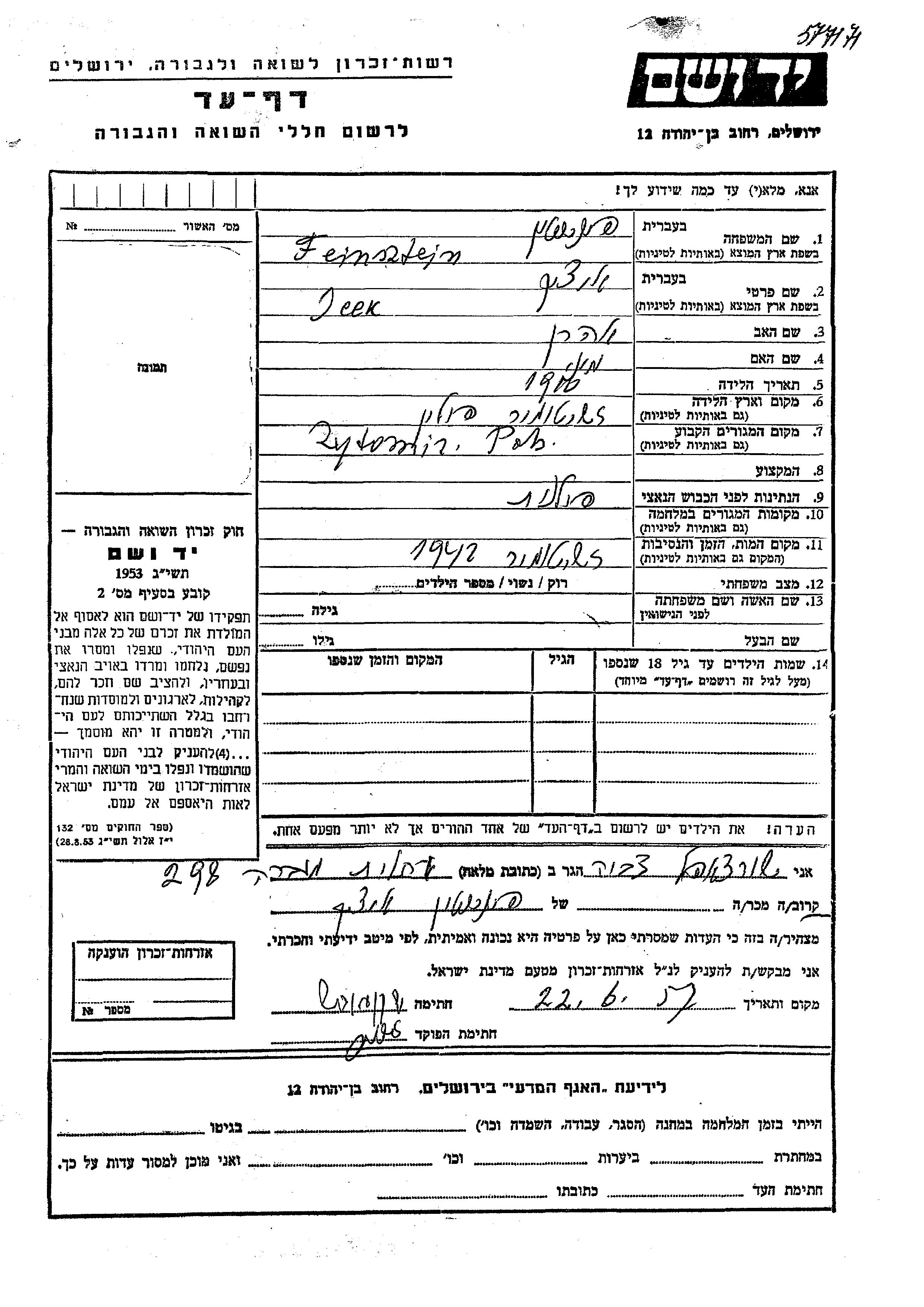 Icek Feinsztejn was born in Zhytomyr, Ukraine (USSR), 1900 to Aharon and Mini. Prior to WWII he lived in Zhytomyr, Ukraine (USSR). Icek was murdered in the Shoah. Place of death: Zhytomyr, Ukraine (USSR), 1942.