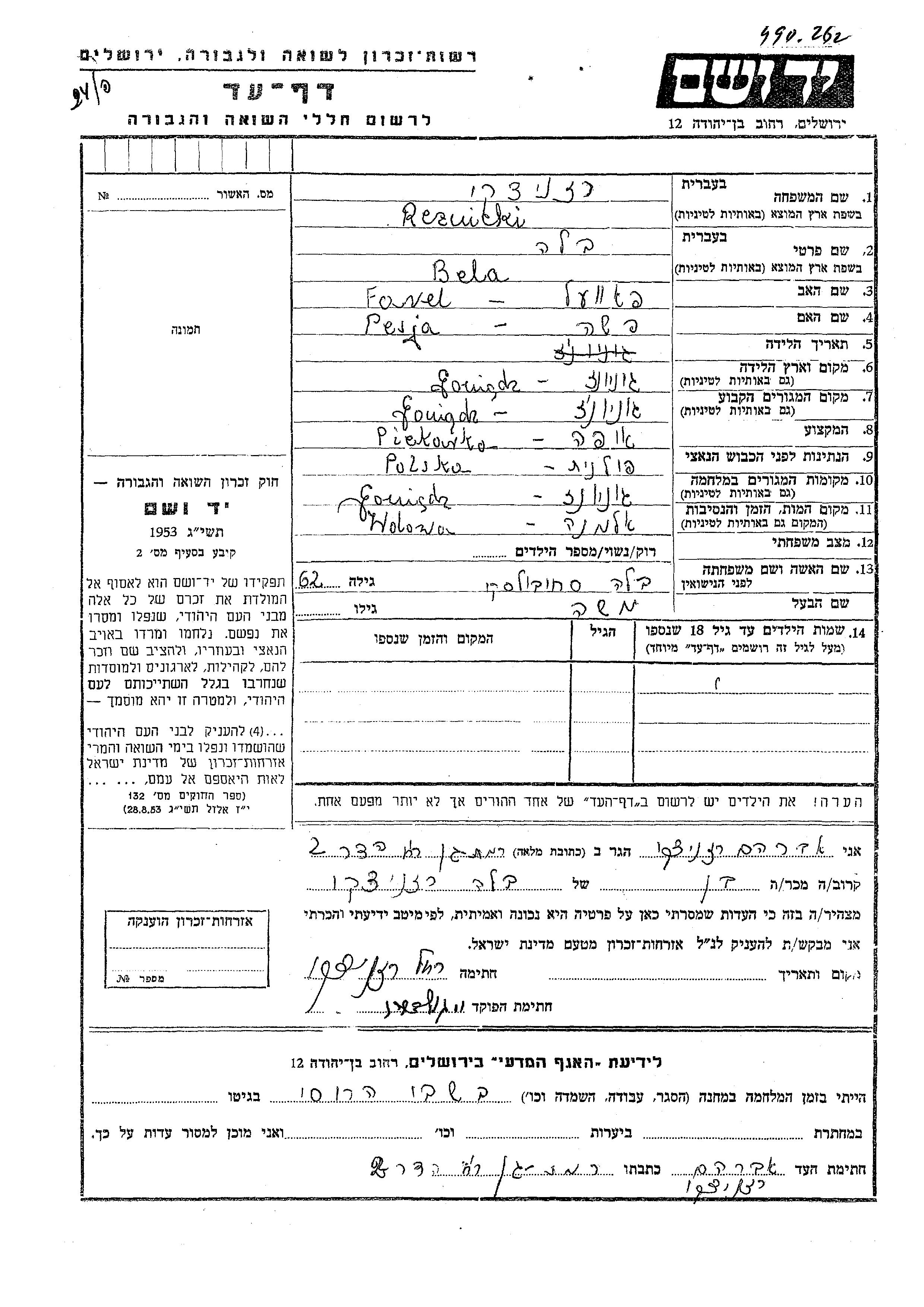 Bela Reznicki was born in Goniadz, Poland to Favel and Pesja. She was a baker and a widow of Moshe. Prior to WWII she lived in Goniadz, Poland. During the war she was in Goniadz, Poland. Bela was murdered in the Shoah. Place of death: Wolowa, Czechoslovakia.