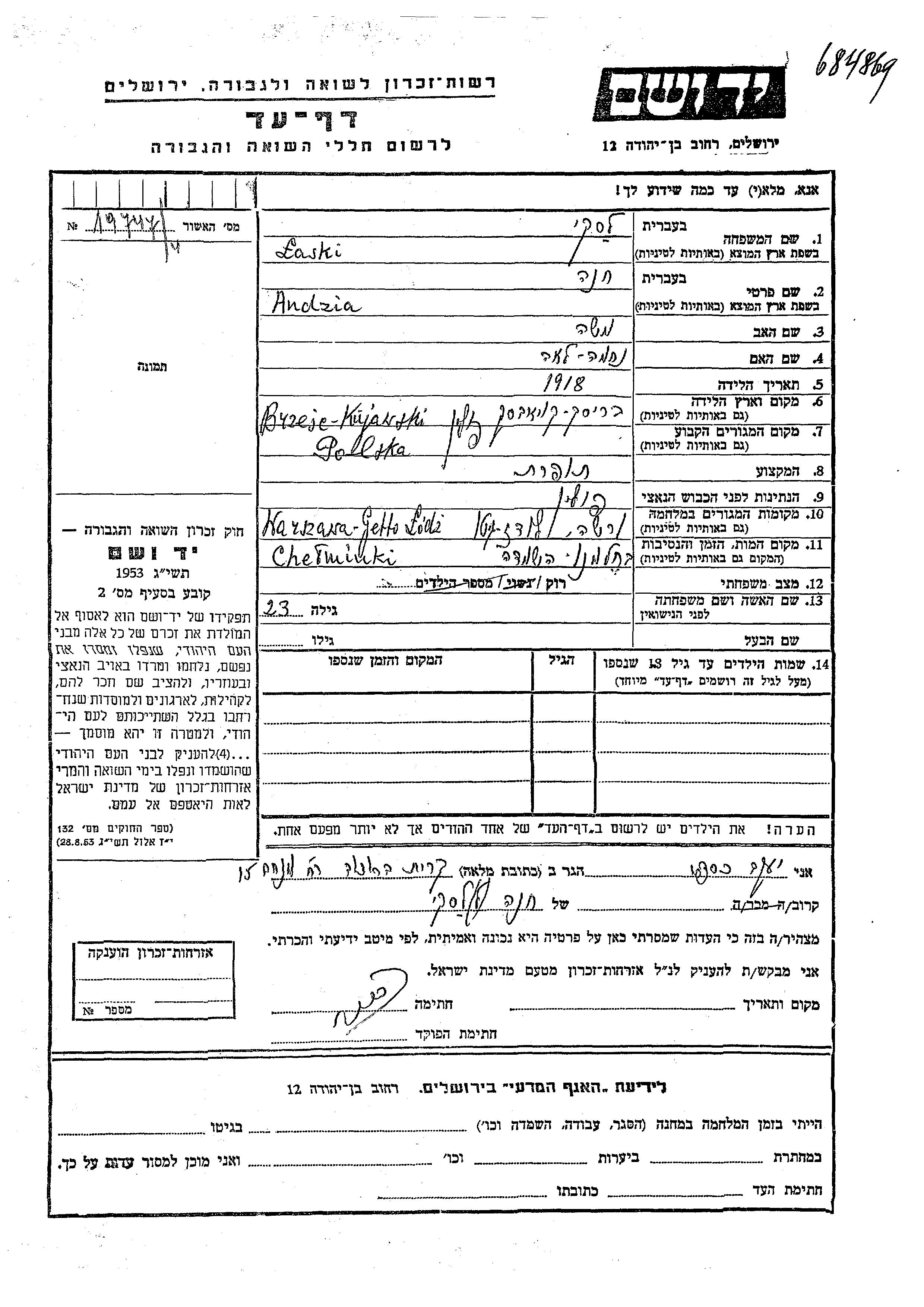 Andzia Khana Laski was born in Brzesc Kujawski, Poland, 1918 to Moshe and Nekhama Lea. She was a seamstress and single. Prior to WWII she lived in Poland. During the war she was in Lodz, Poland. Andzia Khana was murdered in the Shoah. Place of death: Chelminki.