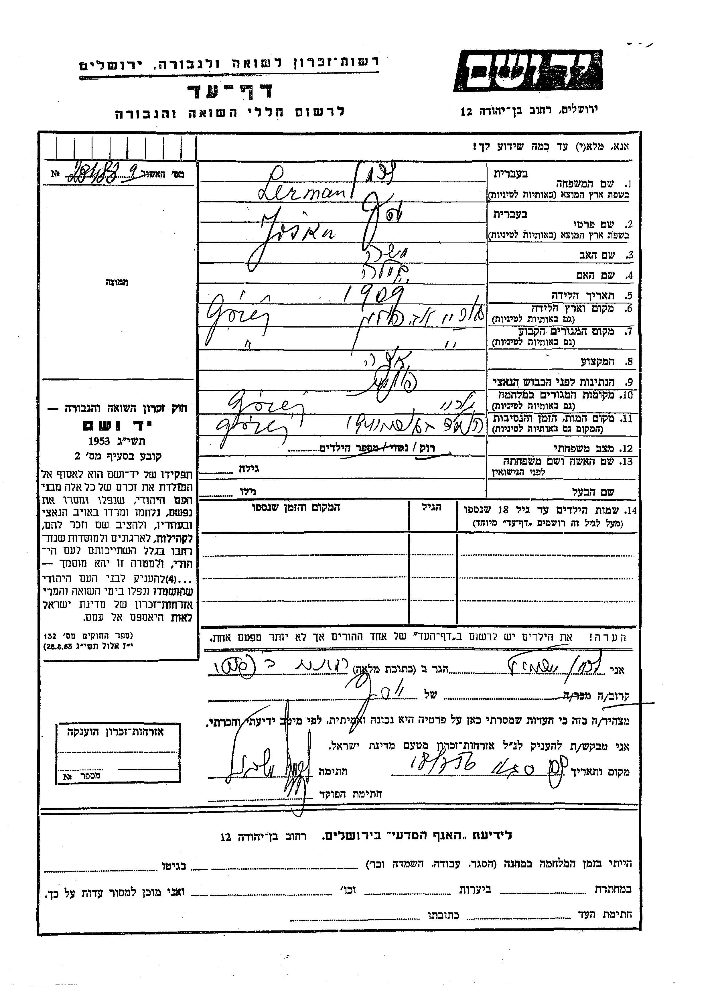 Lerman Joska 1909 Goraj, Poland Page of Testimony