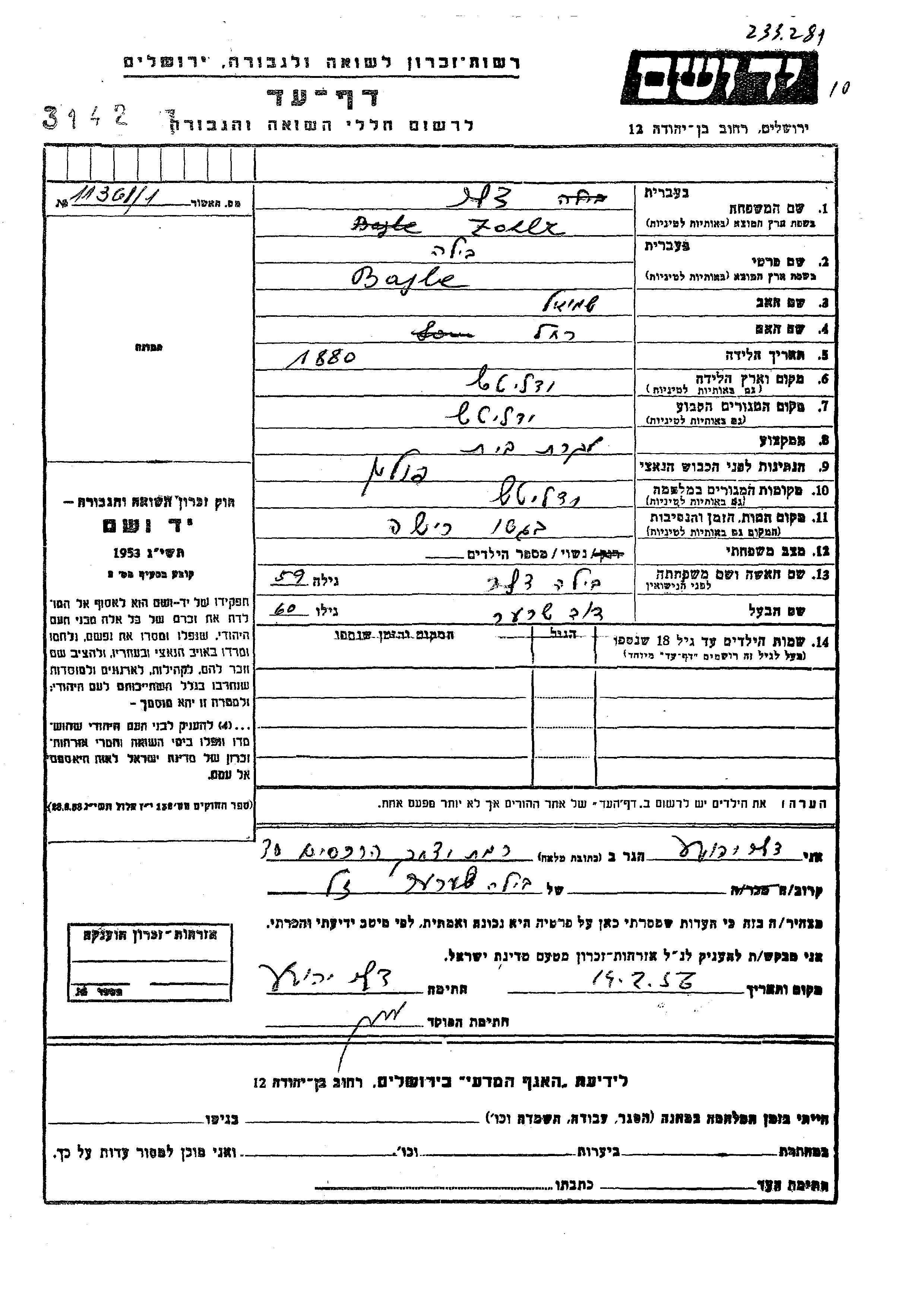 Bajle Zoler Sherer Tzaler nee Zoler Tzaler was born in Jedlicze, Poland, 1880 to Shmuel and Rakhel. She was a housewife and married to David. Prior to WWII she lived in Jedlicze, Poland. During the war she was in Jedlicze, Poland. Bajle was murdered in the Shoah. Place of death: Rzeszow, Poland.