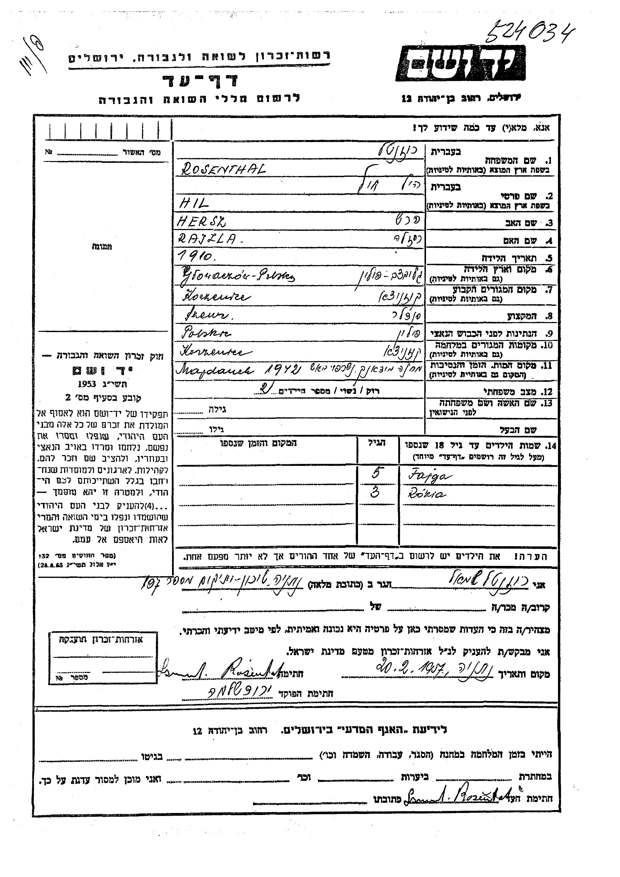Hil Rozenthal was born in Glowaczow, Poland, 1910 to Hersz and Rajzla. He was a shoemaker. Prior to WWII he lived in Koznitz, Poland. During the war he was in Koznitz, Poland. Hil was murdered in the Shoah. Place of death: Majdanek, Poland, 1942.