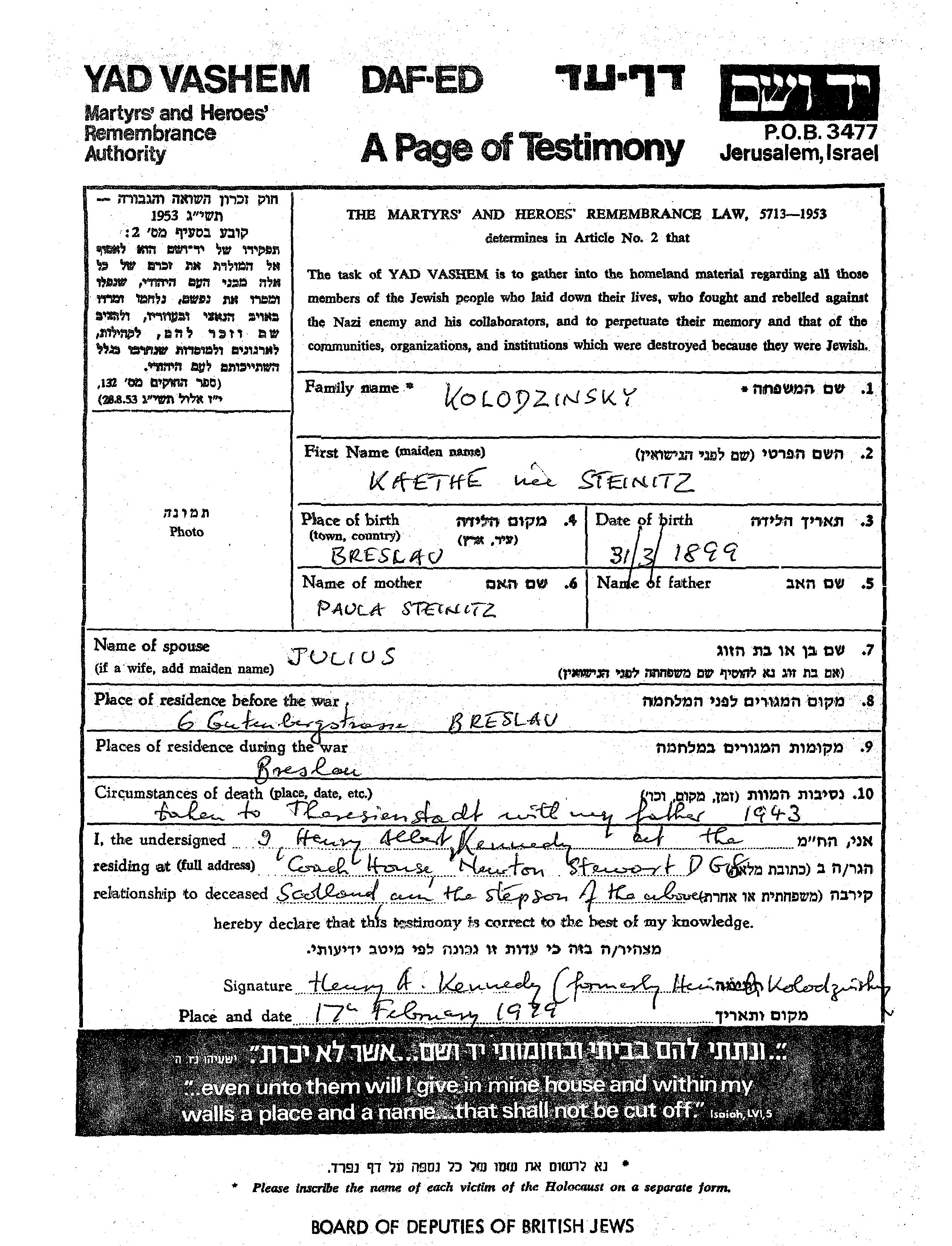 Kaethe Kolodzinsky nee Steinitz was born in Breslau, Germany, 1899 to Paula. Prior to WWII she lived in Breslau, Germany. During the war she was in Breslau, Germany. Kaethe was murdered in the Shoah. Place of death: Theresienstadt, Czechoslovakia, 1943.